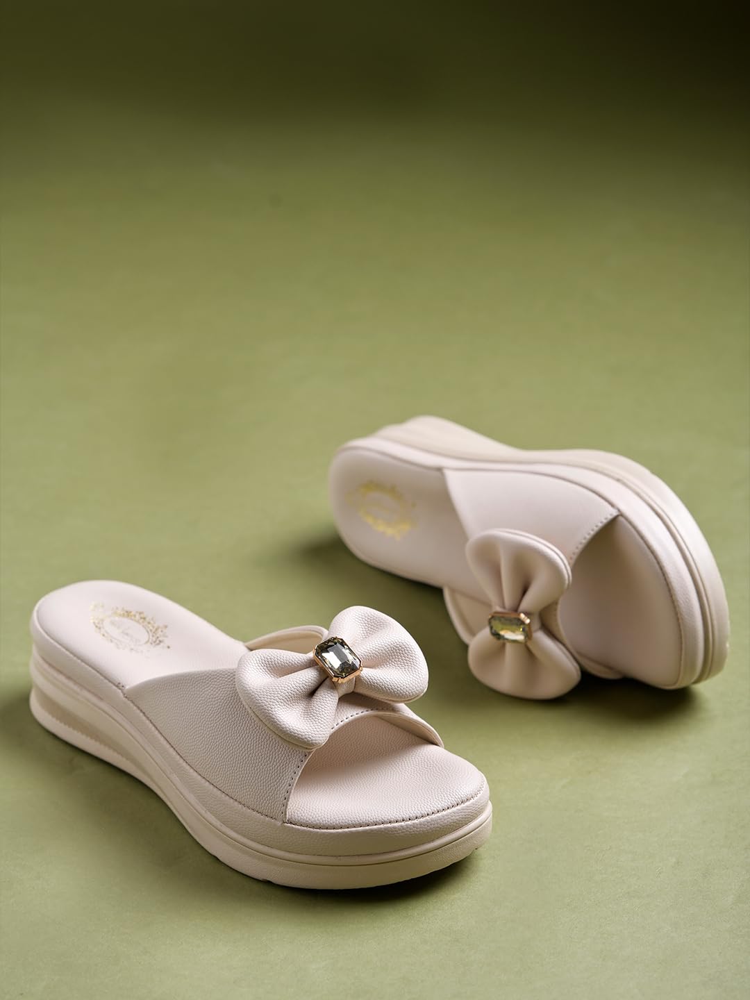 Shoetopia Women’s Slip-On Wedge Sandals | Comfortable Daily Slippers with Bow & Stone Detail | Lightweight Casual Fashion Footwear