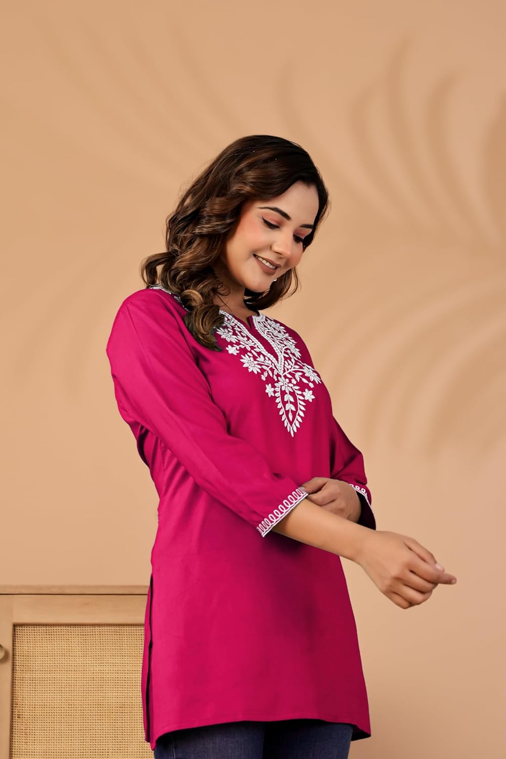 Short Kurti for Women – Lucknowi Chikankari Embroidered Ladies Kurta, Stylish Girls Tunic Top, Comfortable Ethnic Half Kurta for Daily & Office Wear