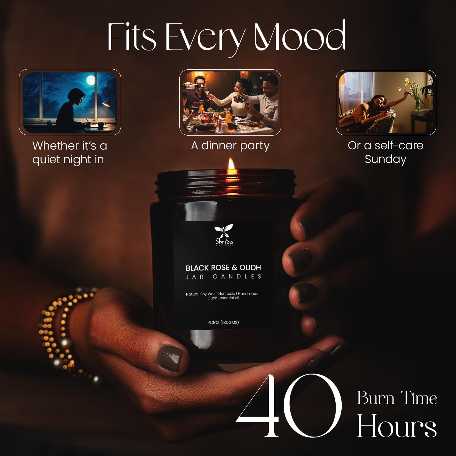 Pure Soy Wax & Real Oudh Aroma: Crafted using 100% plant-based soy wax and pure oudh essential oils for a warm, deep, and comforting scent profile that feels indulgent, soulful, and grounding.