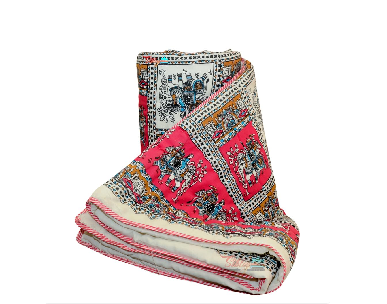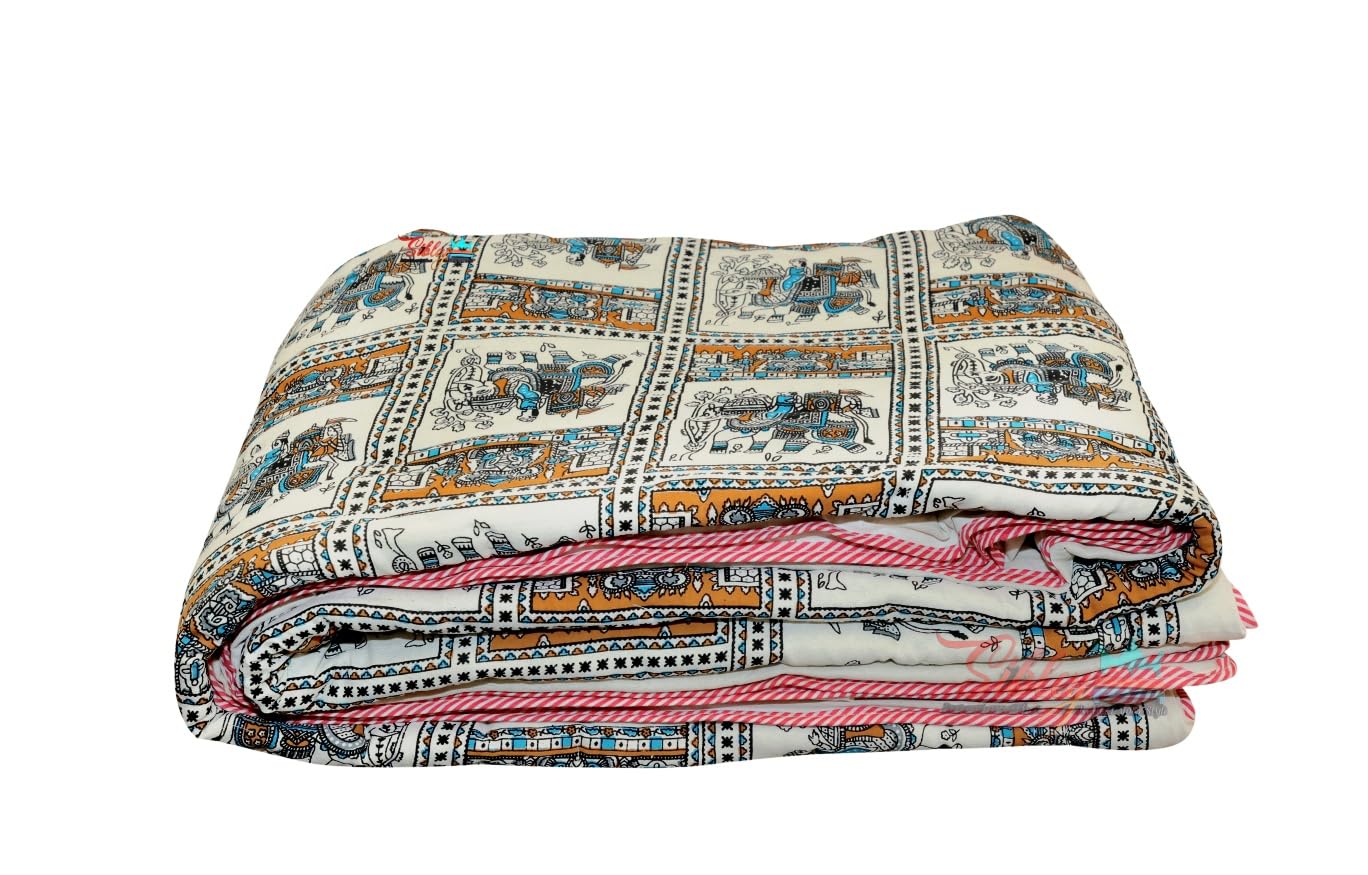 SIBLEY Presents World famous Jaipuri Bed Blanket Razai (Quilt) in traditional print of Rajasthan Jaipuri quilts / Razai are characterized by their incredible feather-weight lightness, softness, and warmth. The brightly colored Jaipuri Quilts can enhance the décor of your bedroom while providing an unmatched level of comfort to you and your family. This cotton Quilt possesses a beautiful print pattern that has been further accentuated with intricate Hand block and screen print. ✔ DOHER – Lightweight, breathable, and designed for all-season use; this flannel throw blanket keeps you cool during summers and warm in winters, ensuring year-round comfort. ✔Material: Screen Printed 100% Cotton Fabric & other side Matching Plain cotton Soft, Pure Cotton & lightweight Jaipuri Rajai/Quilt. ✔100 percent Organic Cotton shell for a rich luxurious feel. ✔Layers of Material: Upper and Last Layer Made From 100% Pure Cotton Cloth, Middle Layer 100% Organic Soft Cotton Inside That Makes This Cotton Quilt Soft and Warm, yet Lightweight. ✔Perfect for usage in Winter and in Air-Conditioned rooms. Jaipuri Bed Blanket Razai Hand Made by skilled artisans with the Pure Organic Cotton with Jaipuri Prints to create a beautifully soft texture & Good Looking. Double hand-stitched pattern to keep the filling in place for Long durabilit