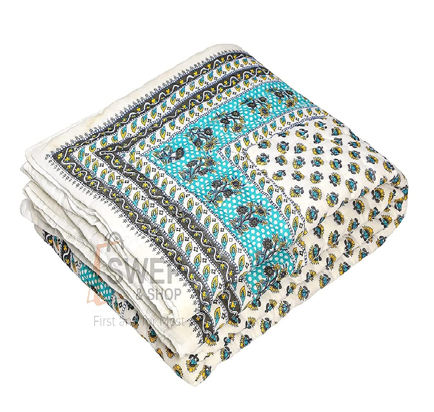 The world-famous Jaipuri pure cotton set single bed razai (Quilt) in traditional Sanganer print of Rajasthan. These good-looking, fluffy, hand-made Indian quilts are a specialty of Jaipur. This spectacular quilt will enhance the beauty of your home decor as well as provide you warmth on cooler winter nights.