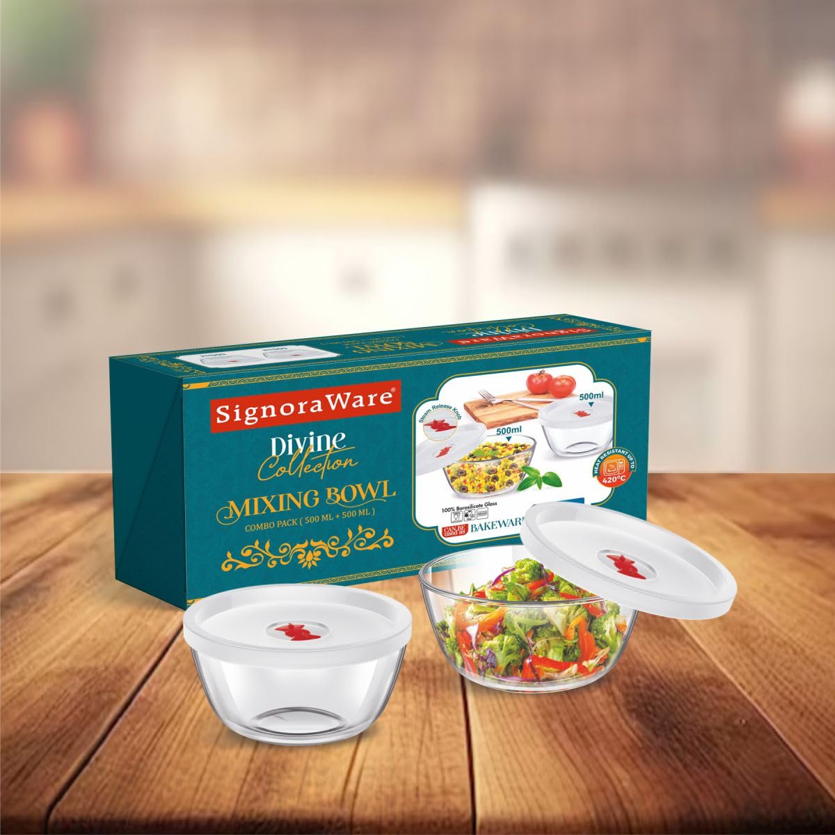 Material Description: Dimension: 13cm each x 13cm each x 7cm each | Capacity: 500ml x 2 | The SignoraWare Mixing Bowl set , crafted from top-notch borosilicate glass. This isn’t your average glass; it’s super strong, heat-resistant, and shrugs off scratches. Say goodbye to worries about thermal shock and hello to lasting clarity in your kitchen!