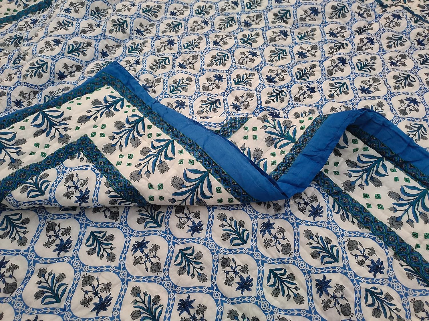 ✔ Colour: Blue | Material: Cotton | Pattern:Jaipuri Flower Butti Design With Flower Border| Tread Count: 410 TC Hand Stitched Quilt