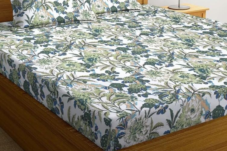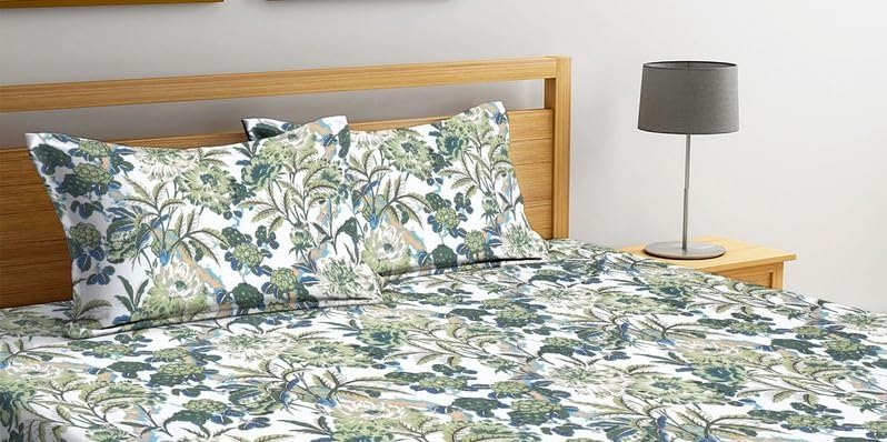 SJH DECOR Home Premium Cotton Flat Double Bedsheets with 2 Pillow Covers | Double Bed Breathable | Wrinklefree | Ultrasoft 210 tc Supersoft | 90 x 90 Inches|Print Floral, White Green