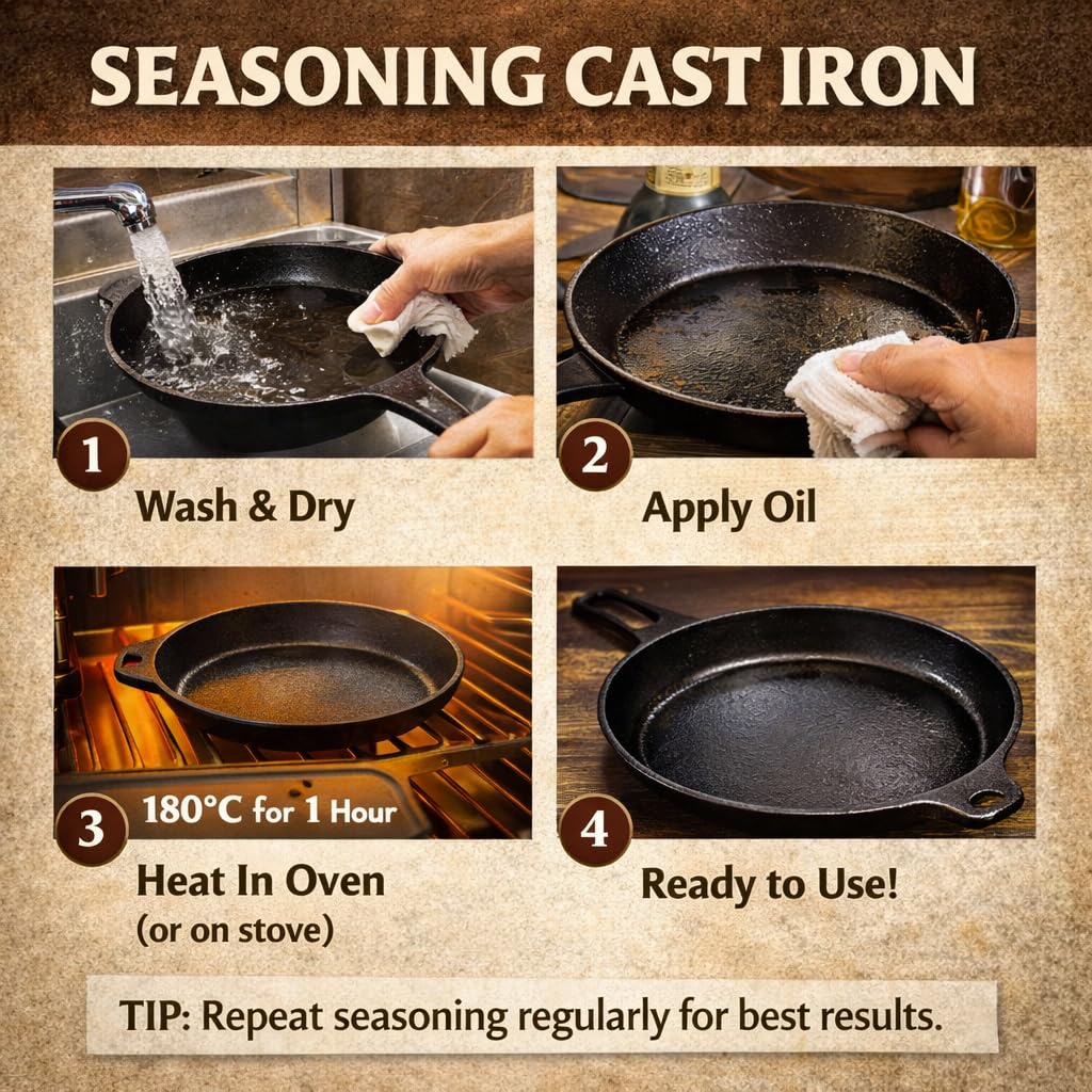 Pre-Seasoned & Ready to Use Comes pre-seasoned with natural oils, allowing immediate use while developing a natural non-stick layer over time.