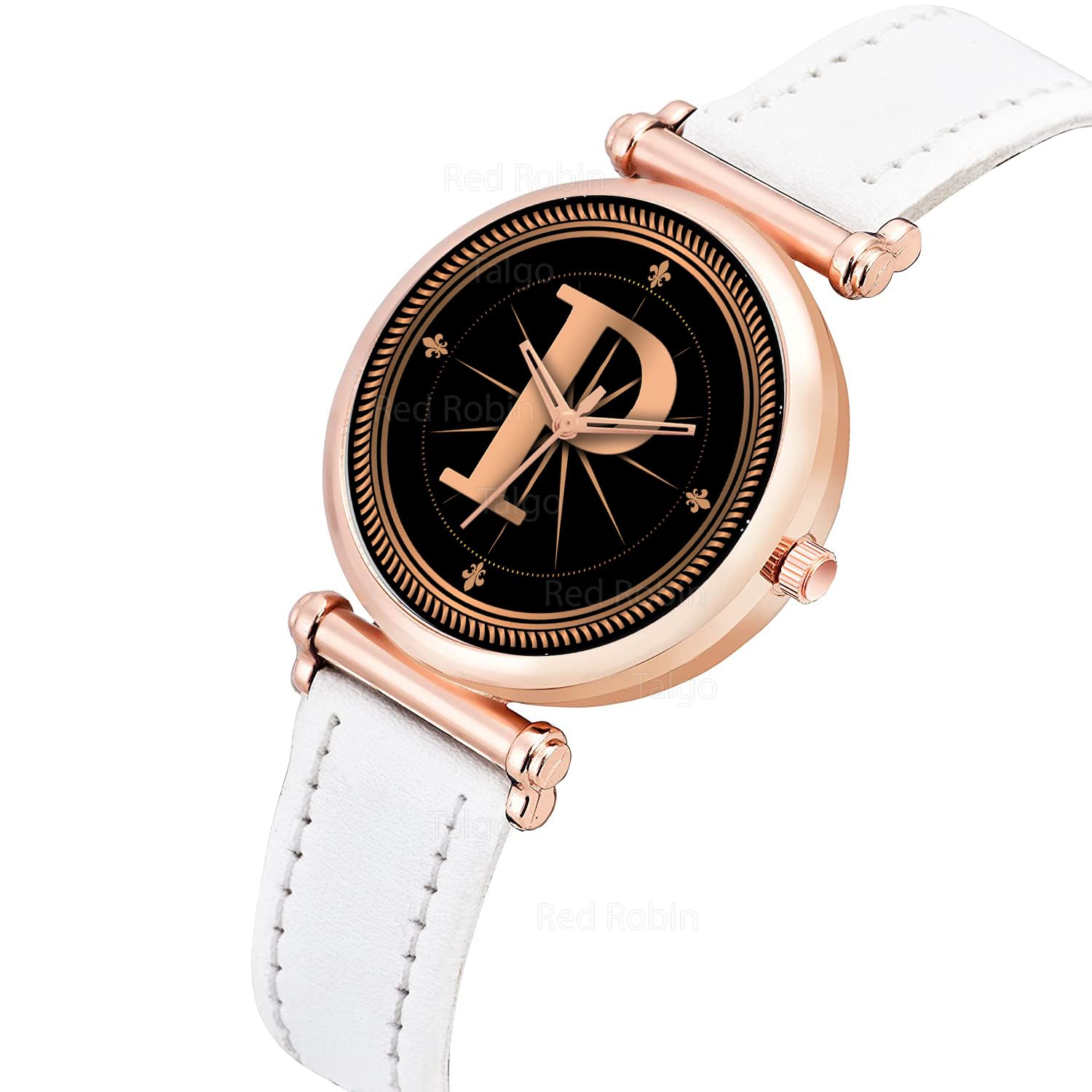 Sky Mart Analog Round Black Dial Alphabet P Design Stylish White Leather Strap Classic Design Fancy Wrist Watch for Women and Girls, Pack of 1 – Alpha-P-RLX-RG-WHT-L