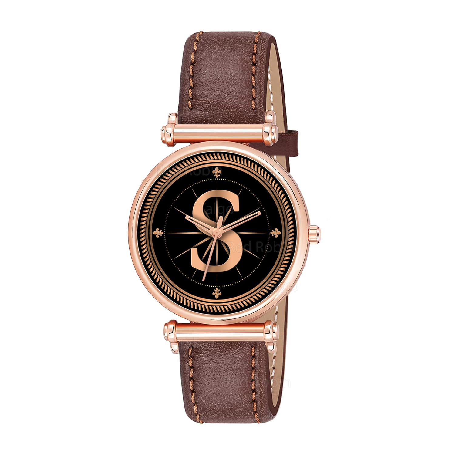 Sky Mart Analog Round Black Dial Alphabet S Design Stylish Brown Leather Strap Classic Design Fancy Wrist Watch for Women and Girls, Pack of 1 – Alpha-S-RLX-RG-BRW-L