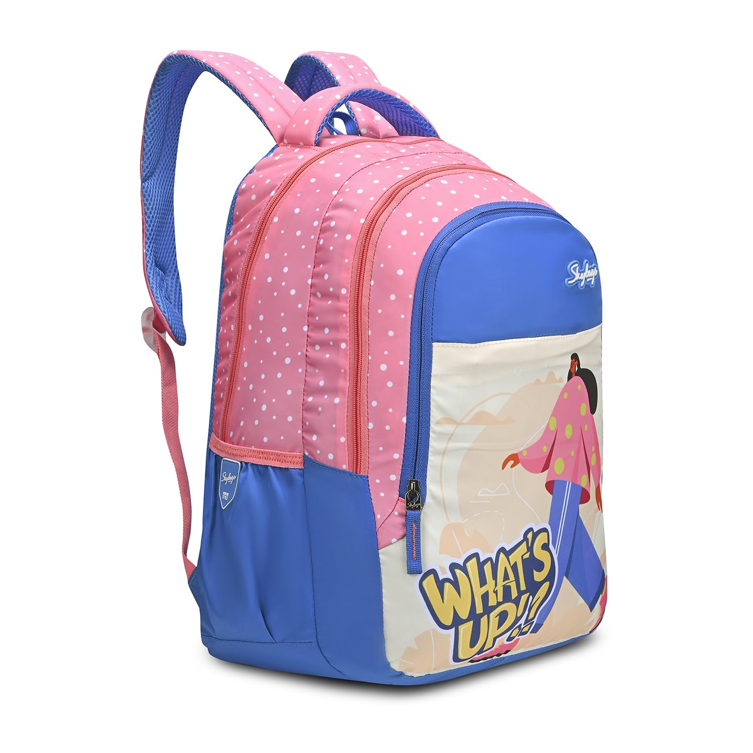 Skybags Blossom is a 36L school bag for girls with trendy design, 3 spacious compartments, padded straps & air mesh back for comfort. A stylish backpack for kids & women with bottle pockets – perfect for school, travel & daily use.