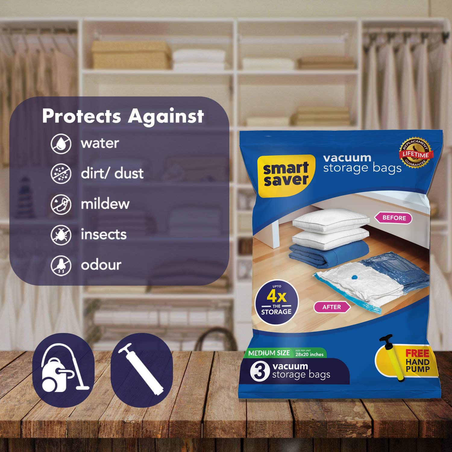 SmartSaver vacuum storage bags are air-tight with it’s Double-Zip Seal & a Triple-Seal Turbo Valve technology, stopping air going in or out of them. Our waterproof & Airtight SmartSavers Easily protect your packed clothing from odour, bugs, and dirt. . Easy 4 Step follow instructions are provided on every Large Sized Jumbo Smart Space Saver Ziplock Premium Vacuum Storage Bags Pack.