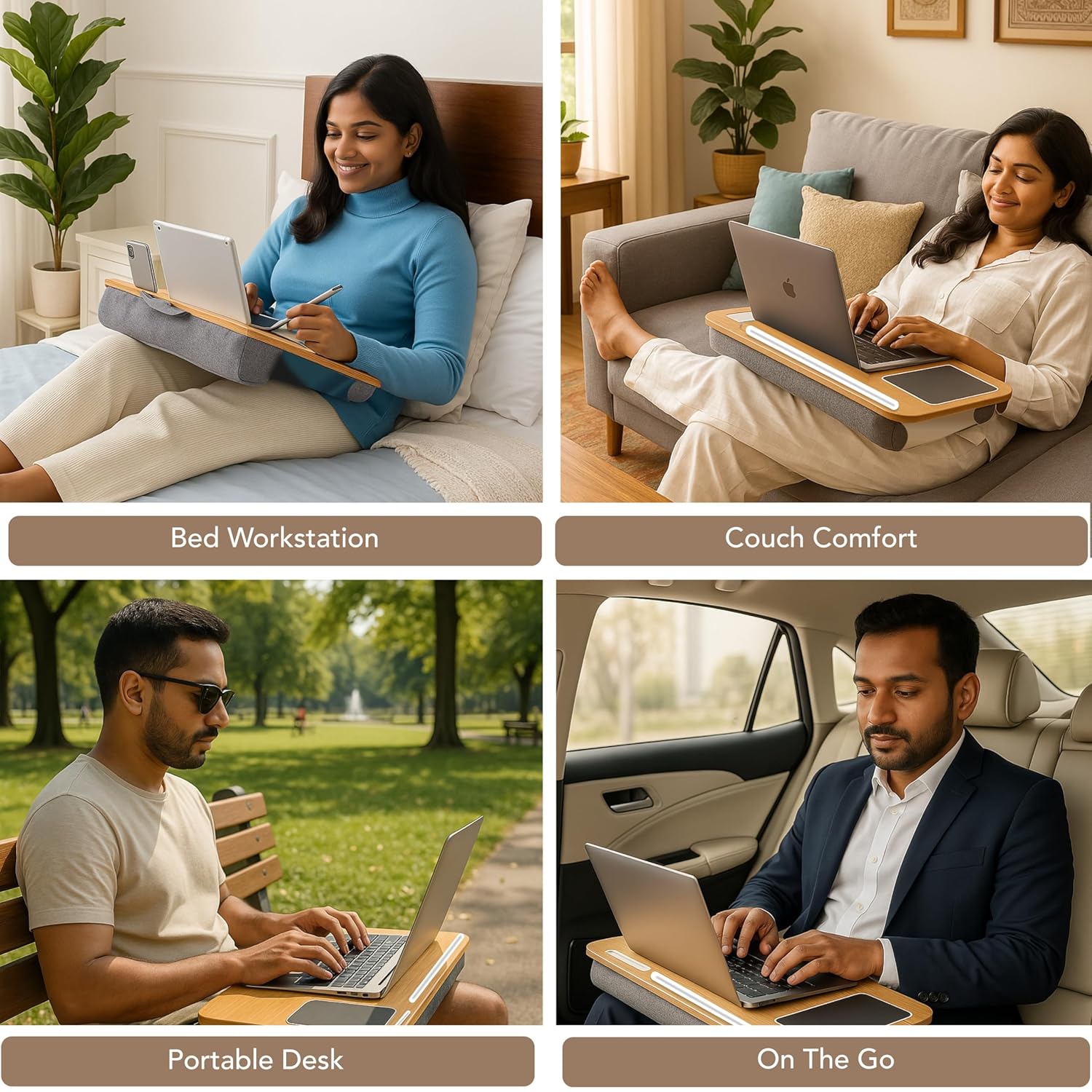 Transform any space into a productive workstation with the LapLuxe Laptop Lap Desk — the perfect companion for your work, study, or leisure needs. Designed for ultimate comfort and convenience, this portable lap desk features a soft cushioned base that provides stability and prevents heat buildup, making it ideal for extended use on your bed, sofa, or floor. The spacious wooden top surface comfortably fits laptops up to 14 inches and includes a fixed mouse pad, wrist support, and dedicated slots for your phone, tablet, and pens, keeping all your essentials within reach. Whether you’re attending virtual meetings, studying for exams, or enjoying a movie night, the ergonomic design supports your posture and enhances your comfort. Lightweight and travel-friendly, the LapLuxe lap table is perfect for work from home setups, gaming sessions, or use as a reading and writing desk. With its elegant finish, smart functionality, and multi-purpose use, it’s the ideal compact workstation for students, professionals, and anyone seeking a stylish, organized workspace on the go