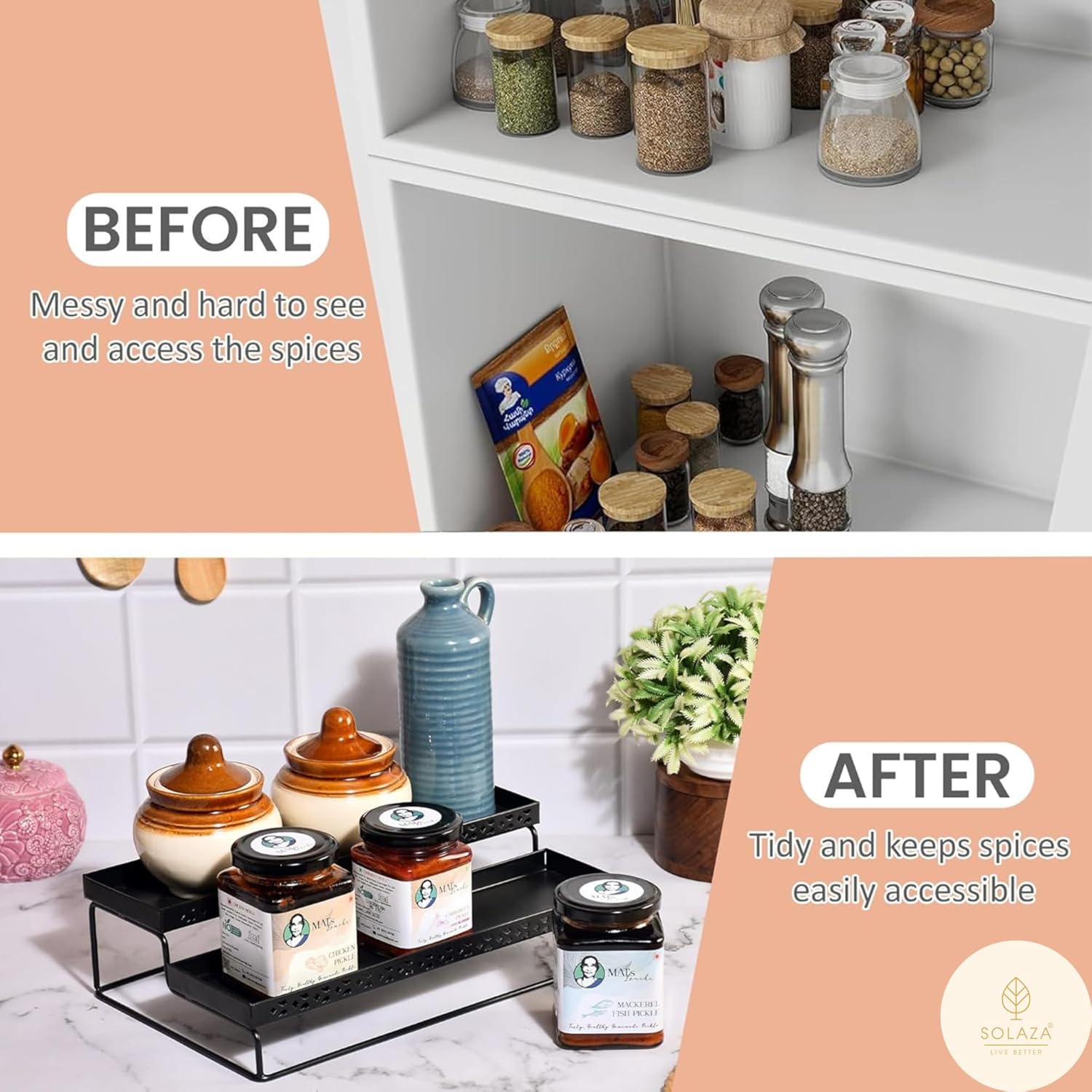 Multi-tiered shelf organizer allows for flexible storage space and easy access to items at different heights. Place your jars, bottle, cans, cosmetics with ease.