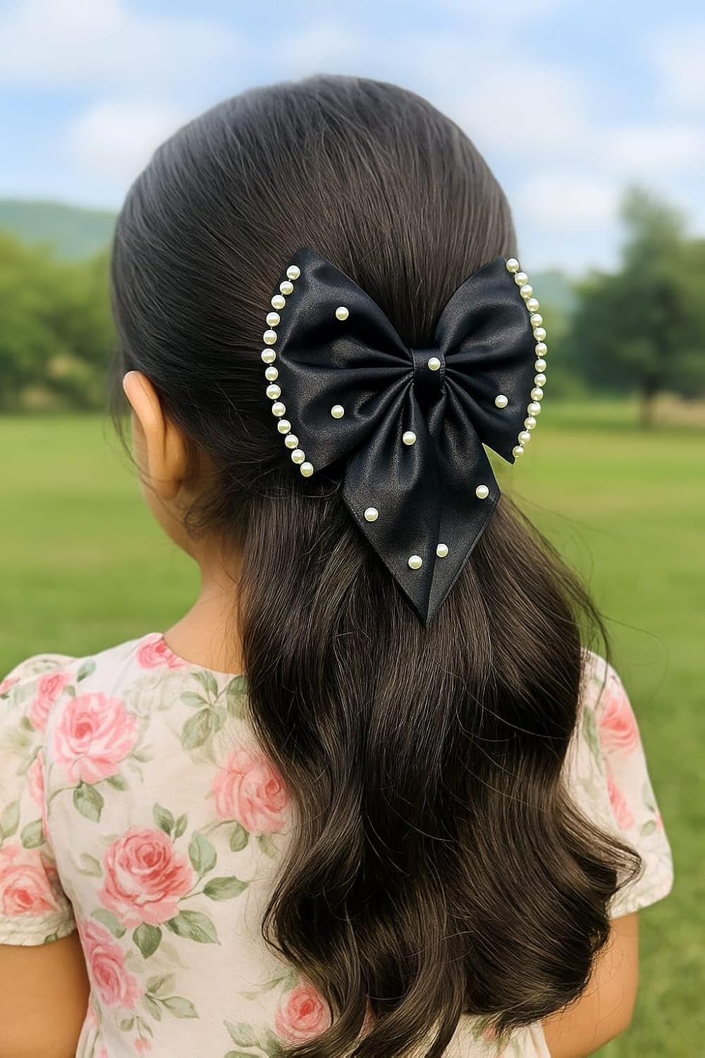 Generic Name : Sparkling Trend Black Satin Hair Bow Clip for Girls & Women – Pearl Studded Big Bow Hair Accessory for Party and gift