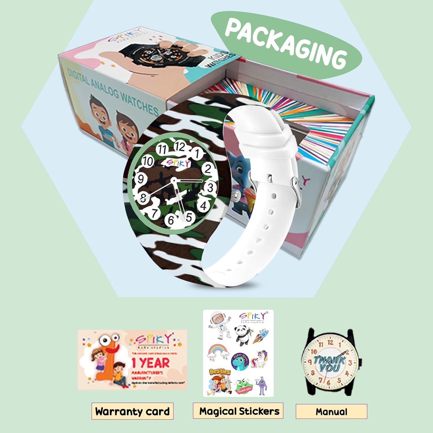 Introducing the Spiky Kids Watch for your little ones! Our kids’ analog wristwatch is designed for both boys and girls aged 3-14 years. Round shape with stylish printed strap, Unbreakable silicon strap for comfort and durability, Lightweight design for easy wear, Water-resistant for added protection. Make time-telling fun and fashionable for your kids with this adorable and durable watch! Best Birthday Gift for Kids.