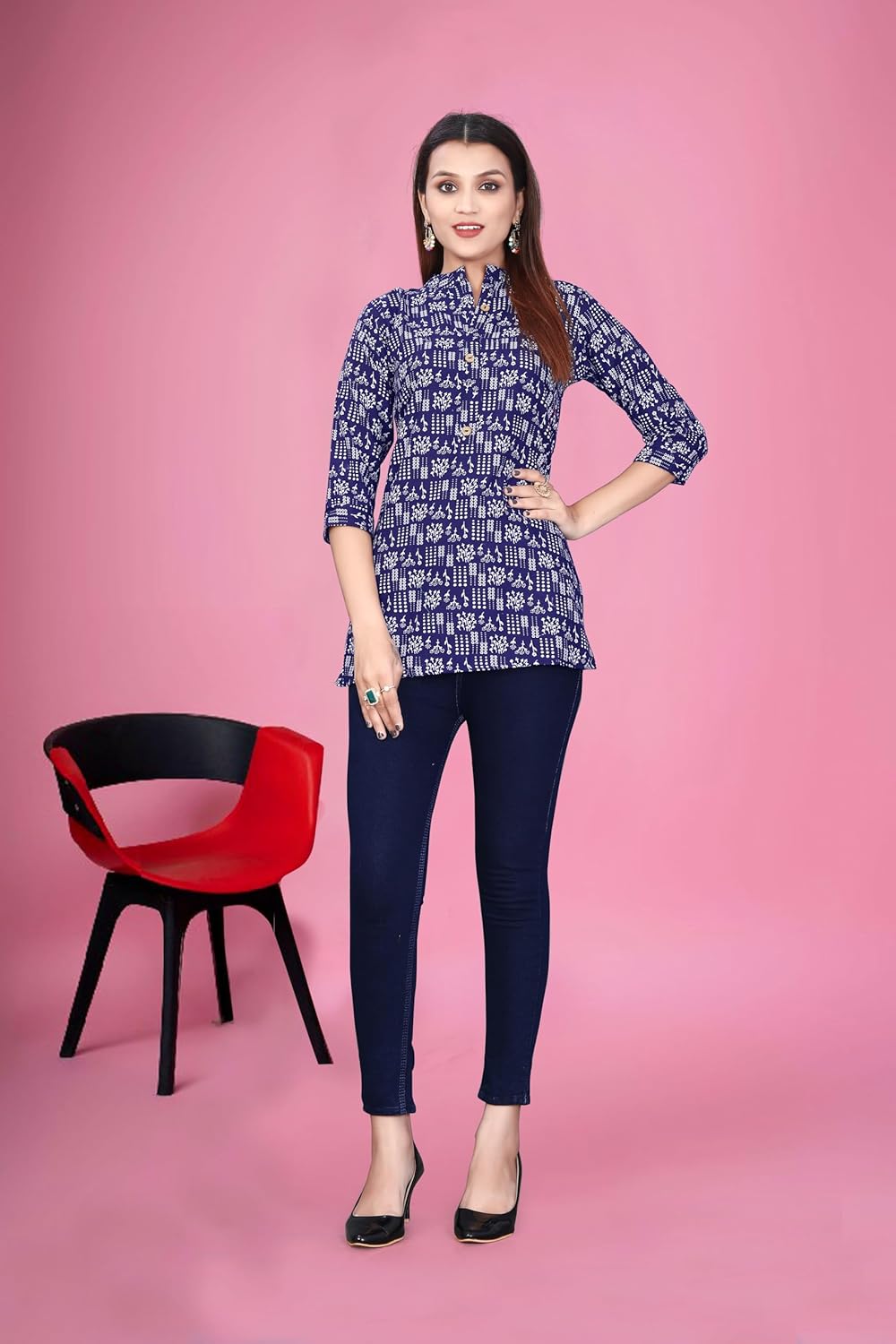 SRIGAA Women Cotton Blend Printed Casual Straight Short Top (in, Alpha, L, Regular, Dark Blue)