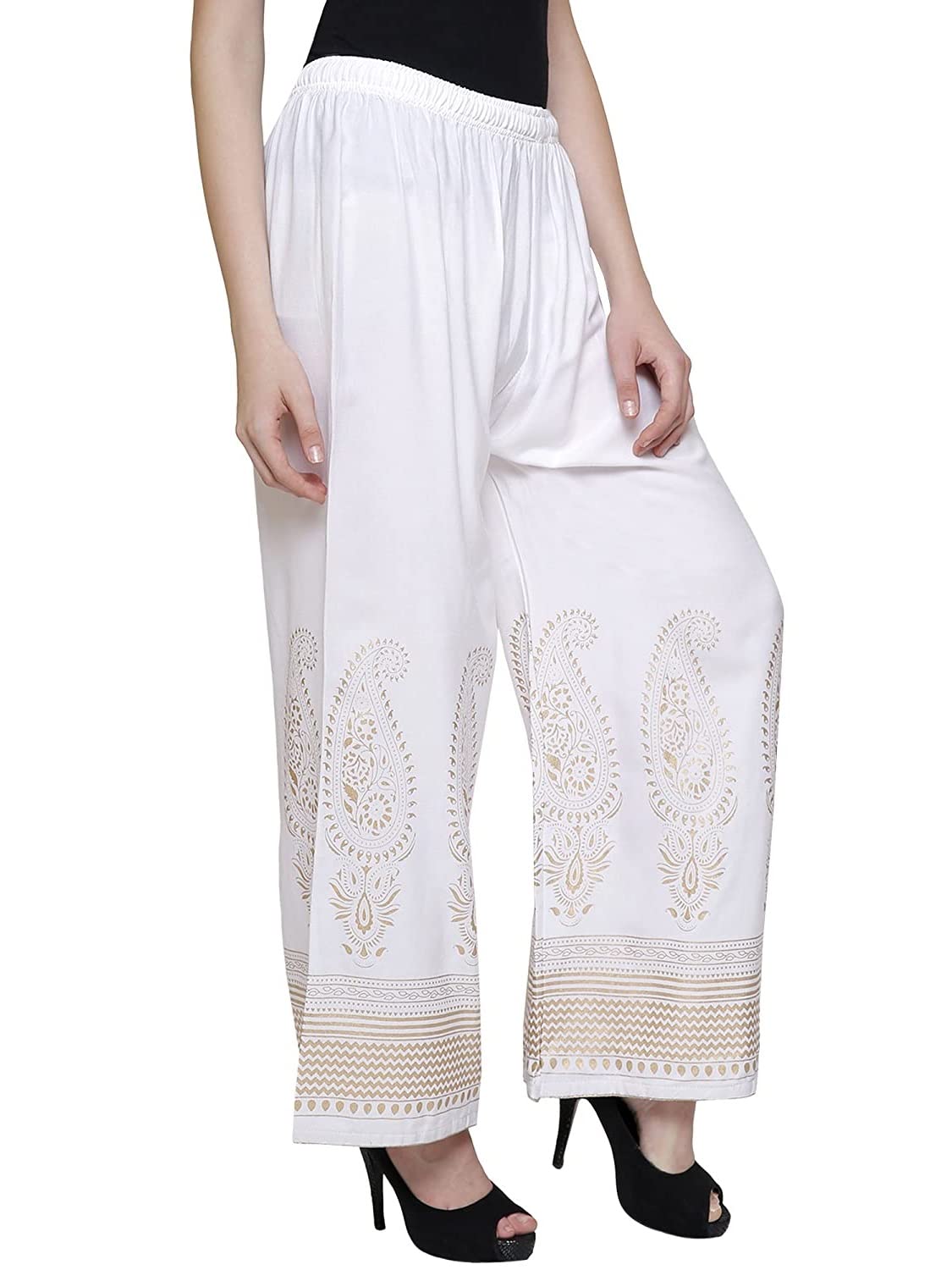 SriSaras Women’s Rayon Gold Print Palazzo Free Size (28-40 INCHES- M,L,XL,2XL)