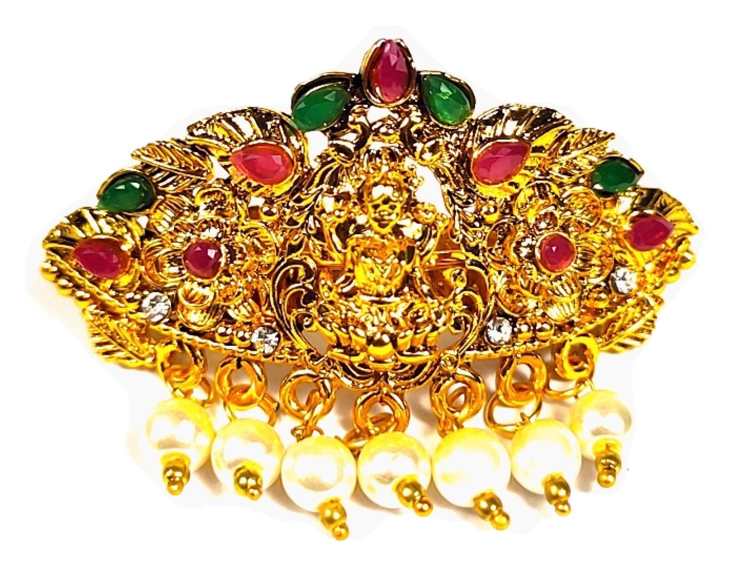 SriShopify Matte Finish Temple Jewellery – Hair Clip with simulated Ruby and Pearl for Womens/Girls Hair Barrettes clips (Godess Laxmi & Flowers Gold plated small Hair Buckle with Emarled)