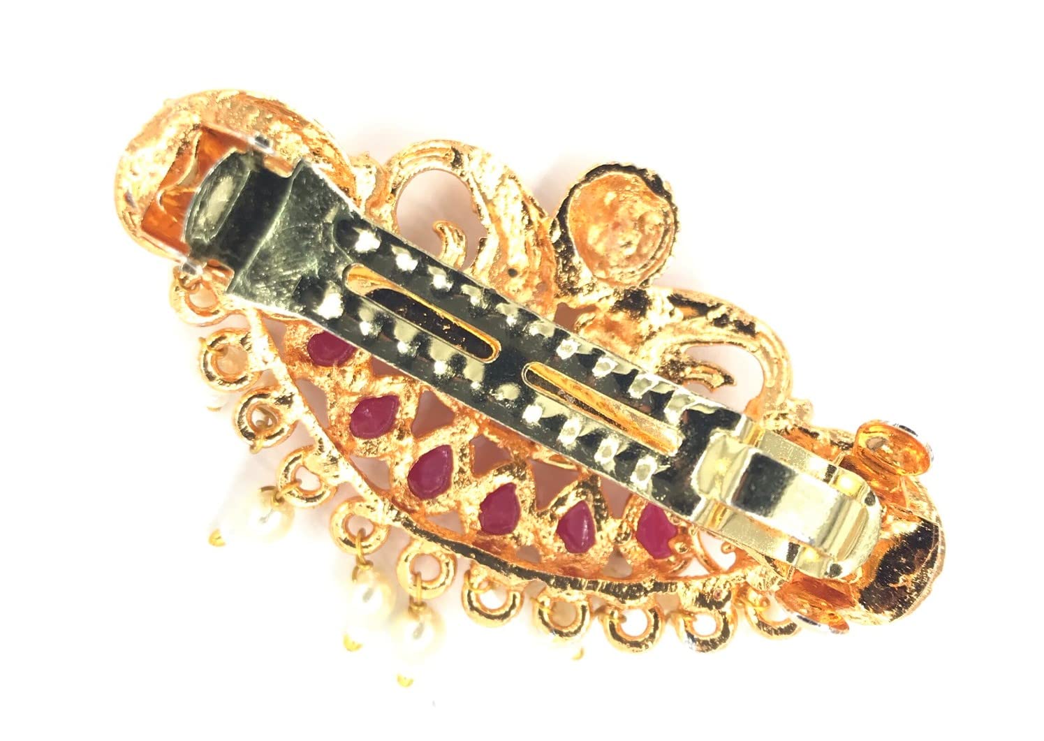 SriShopify Matte Finish Temple Jewellery – Hair Clip with simulated Ruby, Emerald and Pearl for Womens/Girls Barrette (Peacocks model Hair Buckle)