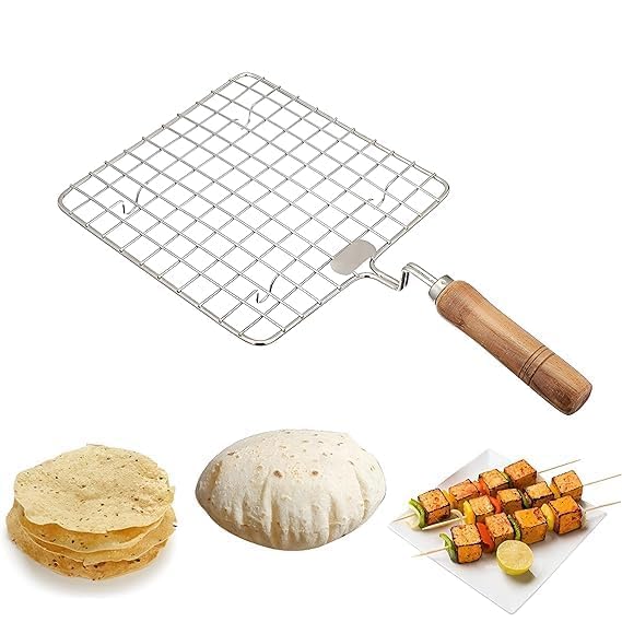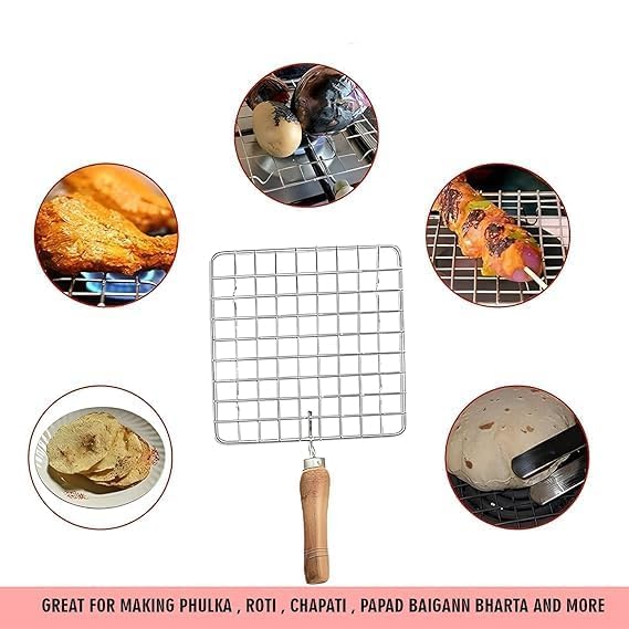 Stainless Steel Grill Roasting Grid with Wooden Handle, Square Kitchen Griddle