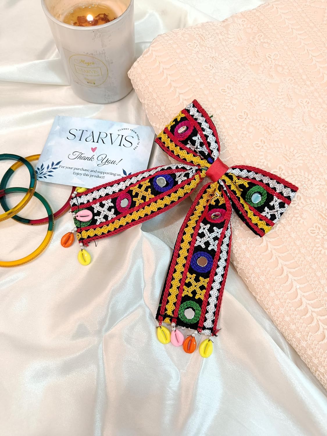 Starvis Navratri Special Hair Accessories Bow Tie Hair Bow Clip – Traditional Embroidered Bow for Women & Girls, Festive Hair Accessory for Garba, Dandiya, and Indian Ethnic Wear Hair Clip with Shell Dandiya Night For Women