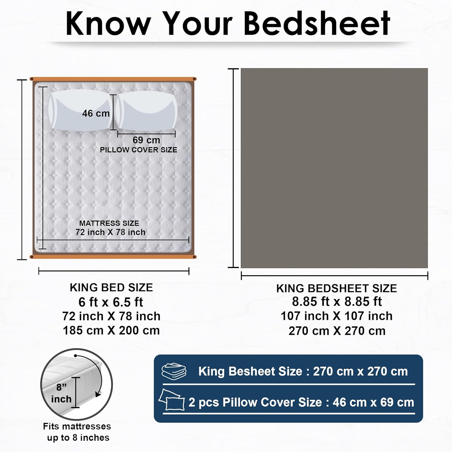 Seamless fit for a serene aesthetic: Designed for a super satin bedsheet queen size , this bedsheet set ensures a flawless drape, giving your room a sophisticated and inviting look. The generous dimensions allow for full coverage and a tailored fit, eliminating the hassle of constantly adjusting your bed linen. Create a refined atmosphere with this bedsheet in king size, blending modern luxury with timeless appeal.