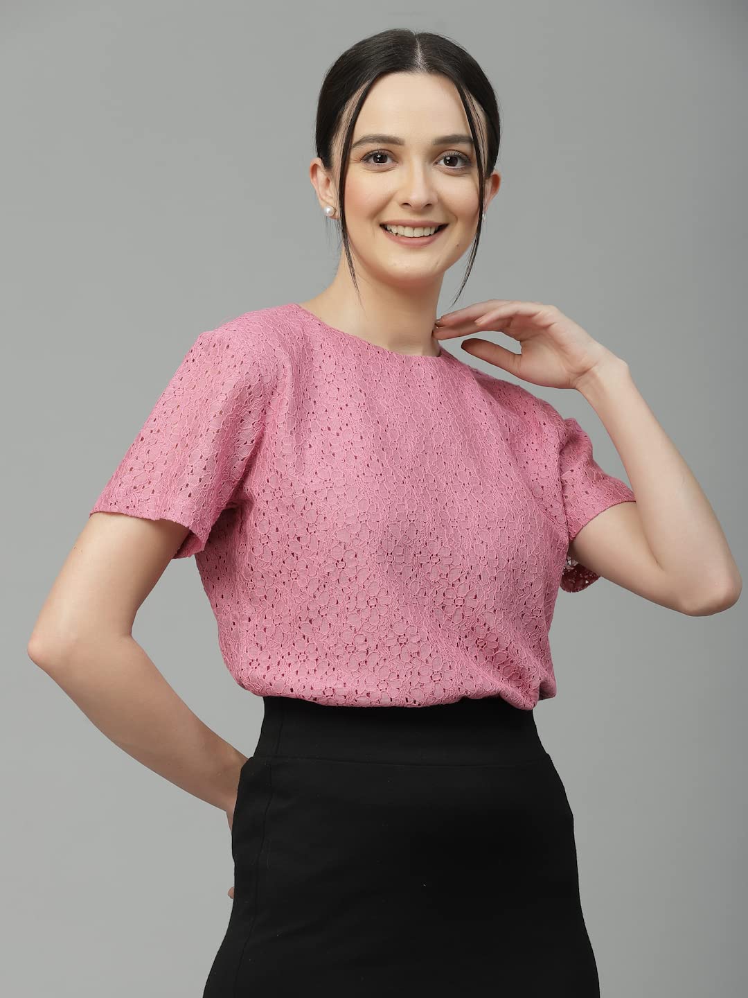 Style Quotient Women Black Self Design Cotton Lace Regular Smart Casual Top
