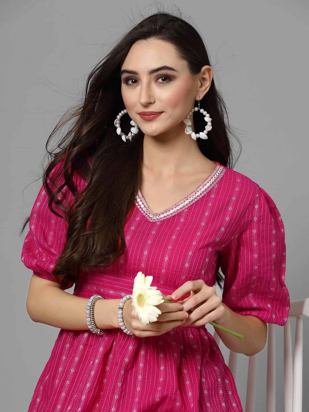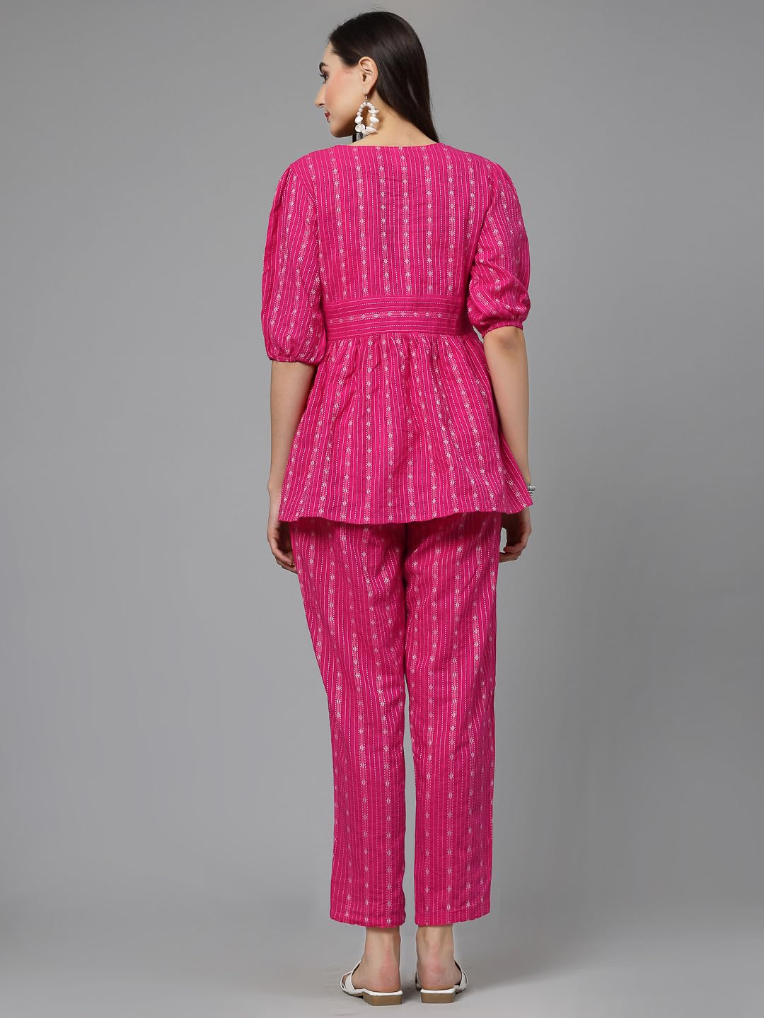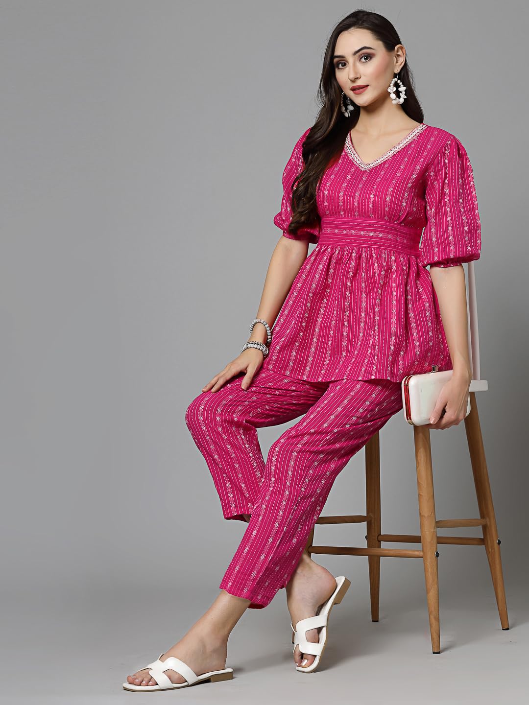 Woven design cotton short top with puff sleeves, embroidery detailing on neckline and trouser which has full elasticated waistband. Pair it with smart footwear and sling to enhance the look. Products Top Length- 31.5″ Inch, Trouser Length- 38” Inch.