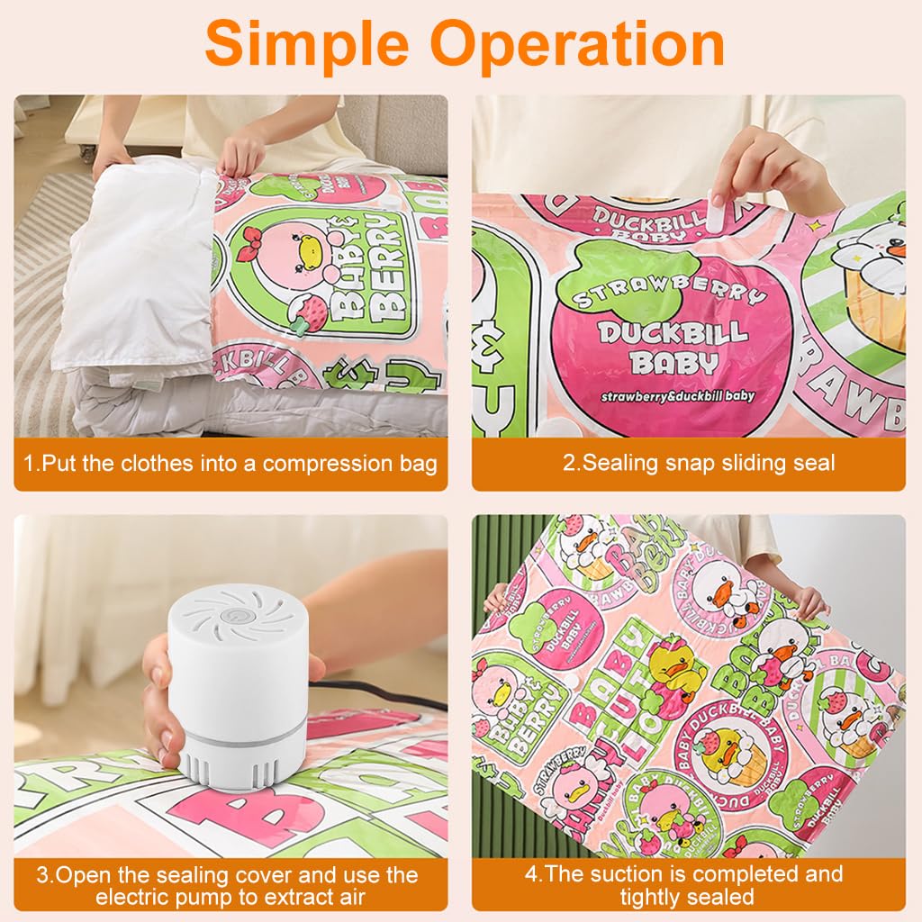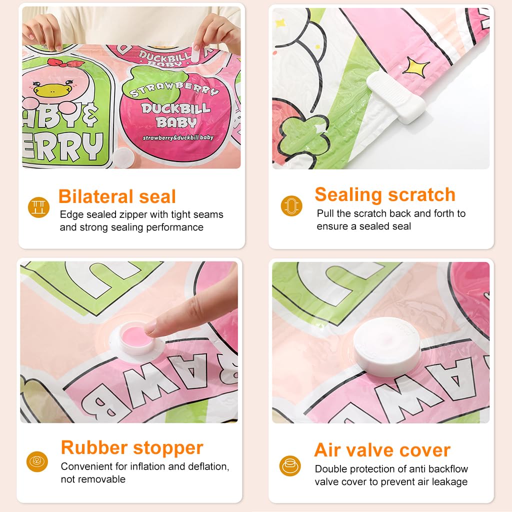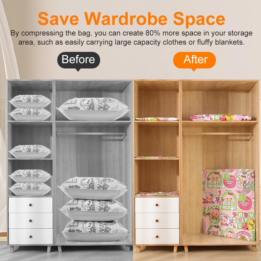 EXCELLENT AIRTIGHT PERFORMANCE: The double sealing strip design, paired with the zip lock closure, guarantees superior airtight performance. This means that once you extract the air using the included hand pump or a vacuum cleaner, the bags will remain tightly sealed without air back to protect items from dirt, dust and other damage. By removing excess air, the bags can create up to 80% more space in your storage area, which can allow you to pack large capacity clothes or fluffy quilts, ect.