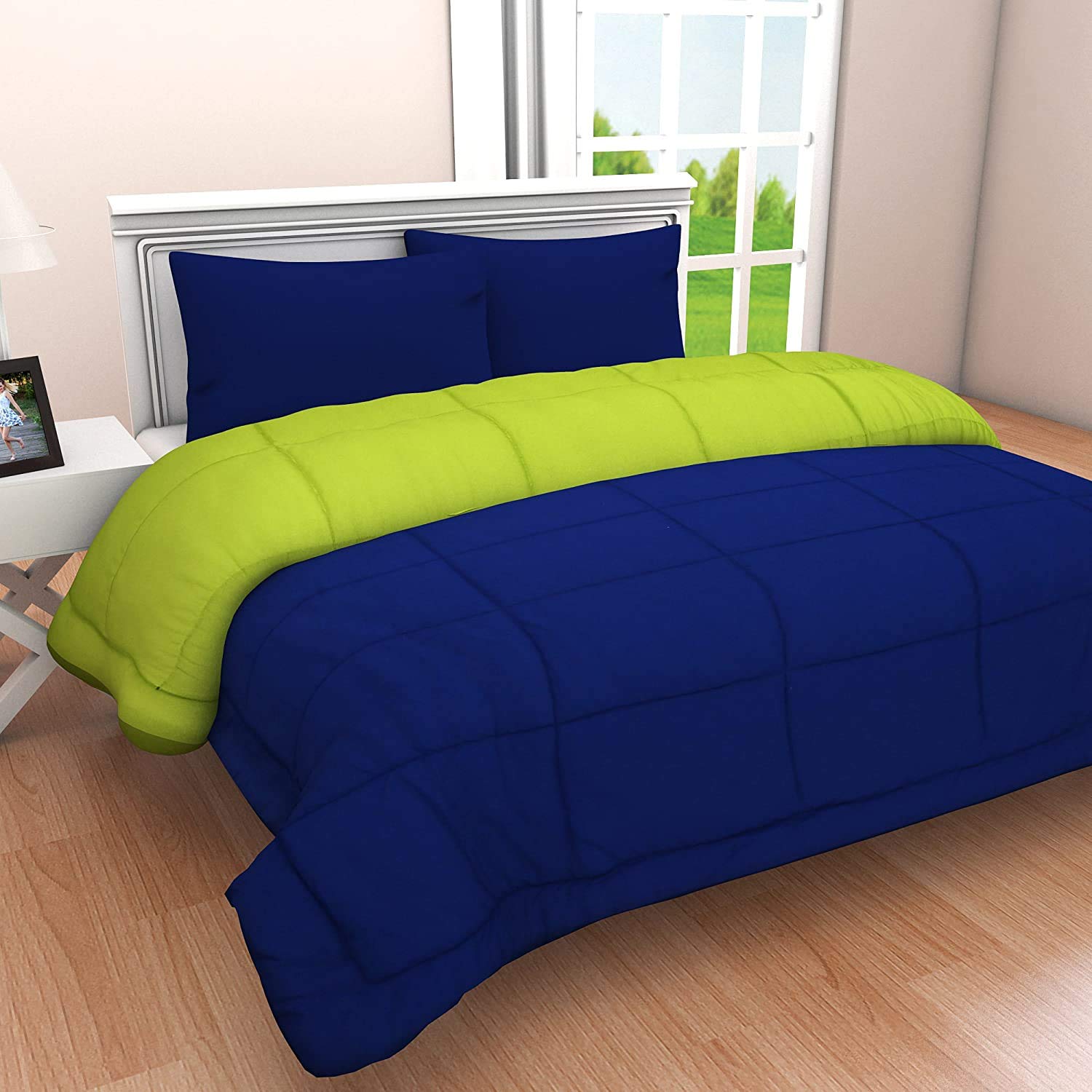 Features: Size : Double 228 cm x 254 cm or 90 inch x 100 inch GSM : 200 Pattern : Diamond Shape Filling : Microfiber Benefits:- Simple Style Place the reversible microfiber comforter on the bed with either side up. A simple flip gives you a whole new look. Both sides come with a diamond-style pattern of stitching, which offers added visual dimension, plus helps to keep the polyester filling evenly dispersed. The Brand SVT reversible microfiber comforter adds simple style, soft texture, and cozy warmth to any sleeping space Loops Secure Duvet cover With 8 corner side Loops Reversible Design A reversible color scheme lets you match your bedroom decor to the season or your mood by simply flipping the comforter. Allergen-Free Comfort Ultra-Soft alternative microfiber fill is hypoallergenic, making it a great alternative to a traditional comforter for those with allergies and other sensitivities. Care Instruction Do Not Wash. Dry Clean Only. Tips- If you want your comforter to last a longer period, so you can use duvet cover.