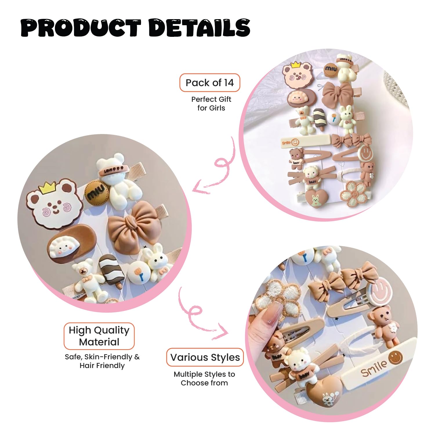 Charming Variety of Designs: This 14-piece set includes adorable Smile, Cute Bear, Bunny, Bow, Flower – khakiall crafted in a cheerful khaki theme to brighten up any hairstyle.