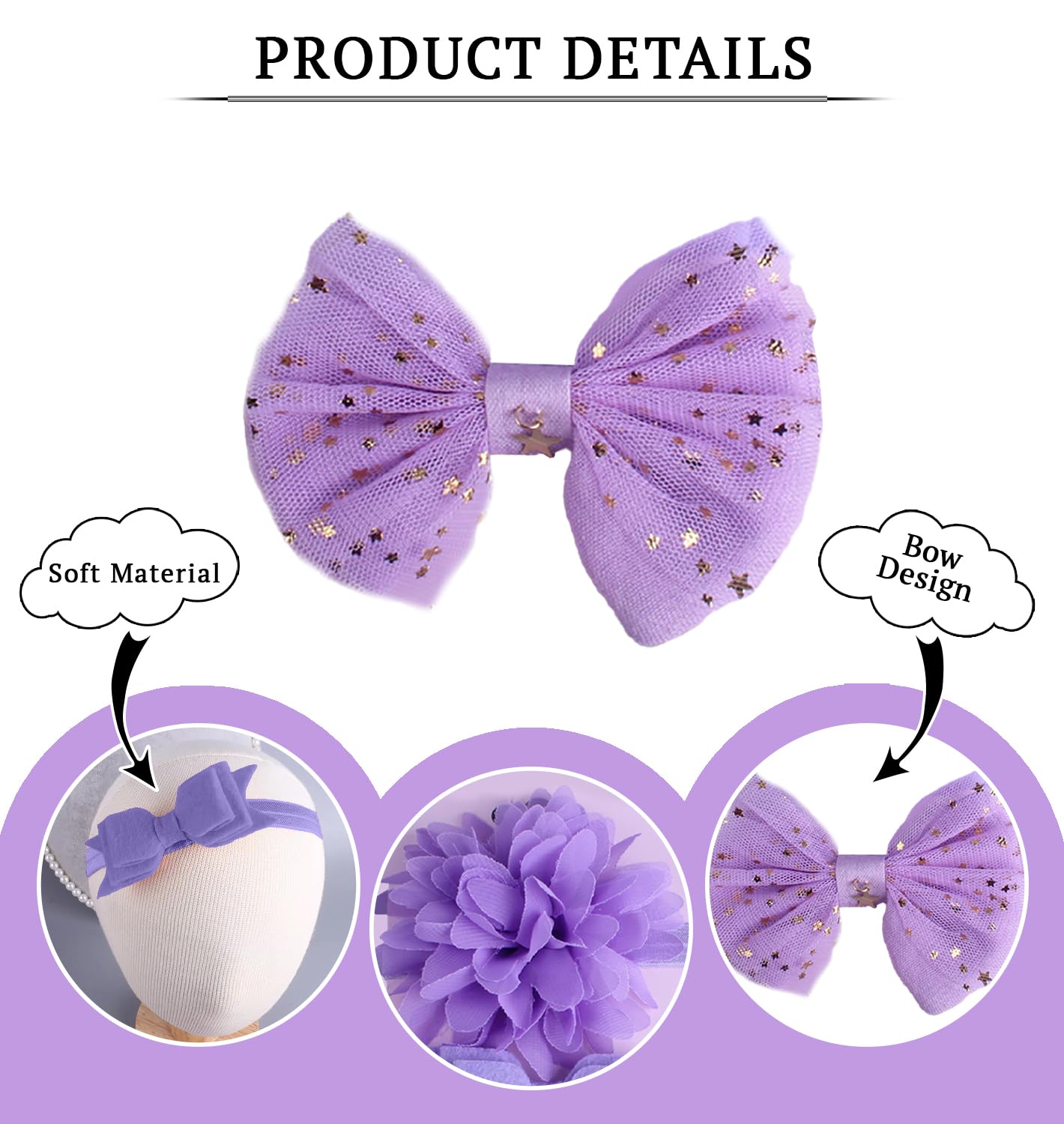 Charming Designs: The set includes three unique designs a large lavender fabric flower, a felt bow, and a tulle bow with gold star accents offering versatility for different outfits and occasions.