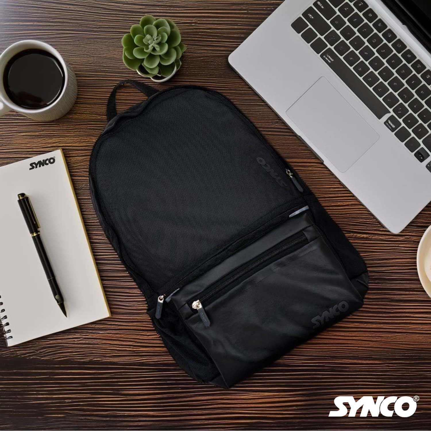 Synco Edge laptop Backpack | 30 Ltrs Premium Backpack with removable Leather Pocket | Water Resistant | for Office/college/Trip (Black)