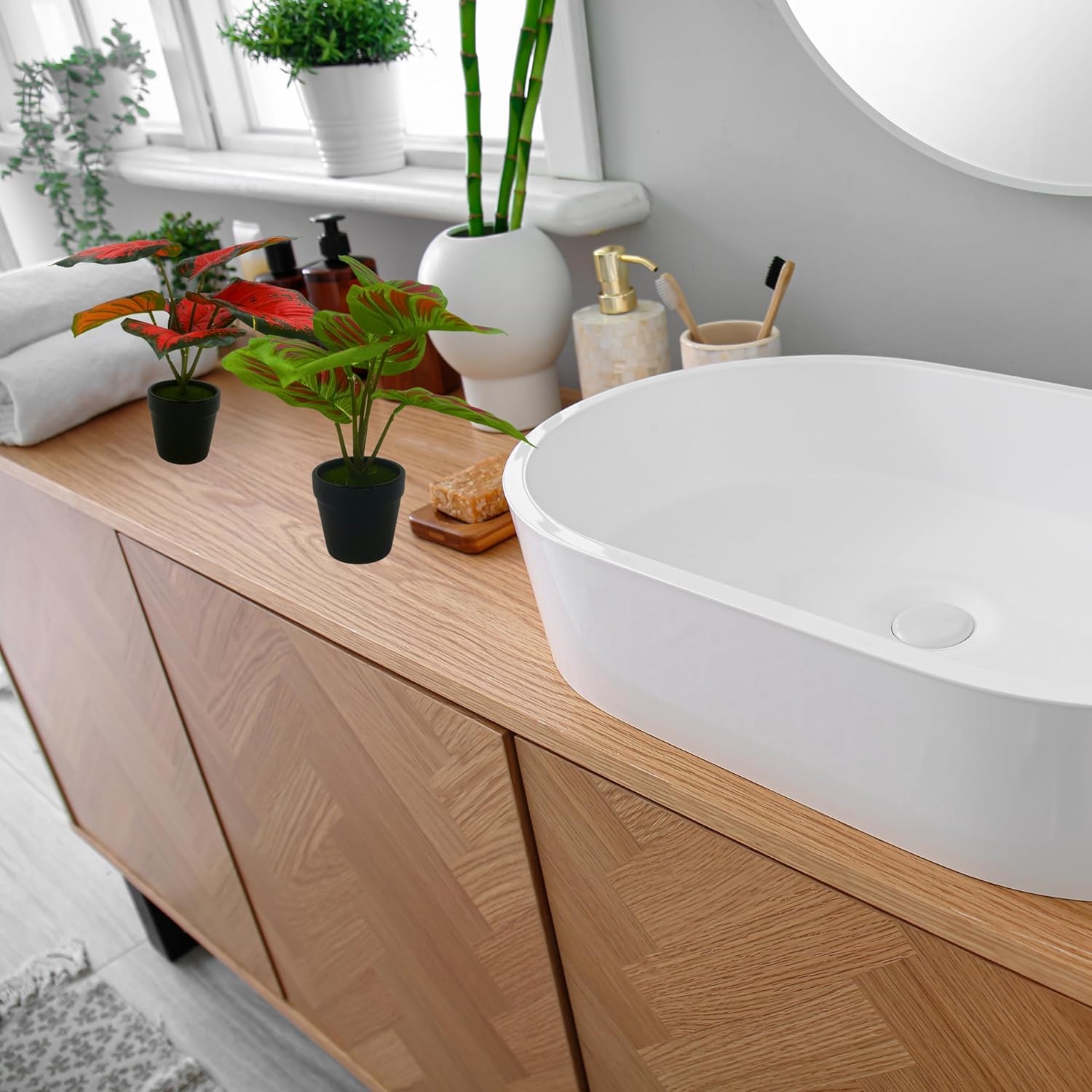 The Tdas small artificial plants with pot made of Quality and Soft Realistic Polyester, plastic. Its vivid design makes it looks like original and real plants which makes it perfect for adding a natural touch to your decor.
