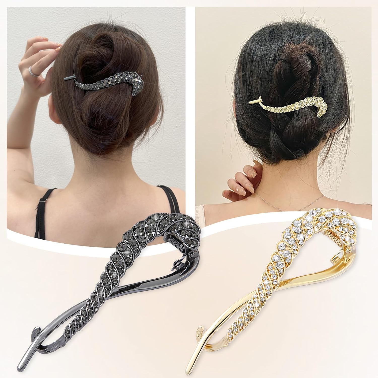 【 Easy to Use 】: The rhinestone hair buns clips for women adopts a unique closing method, making this twist hairpin very convenient to use. The French hairpin only needs two fingers to open and close, twisting movement, no elasticity, no mess, this hairpin can fix your hair bun shape and is easy to put on and take off.