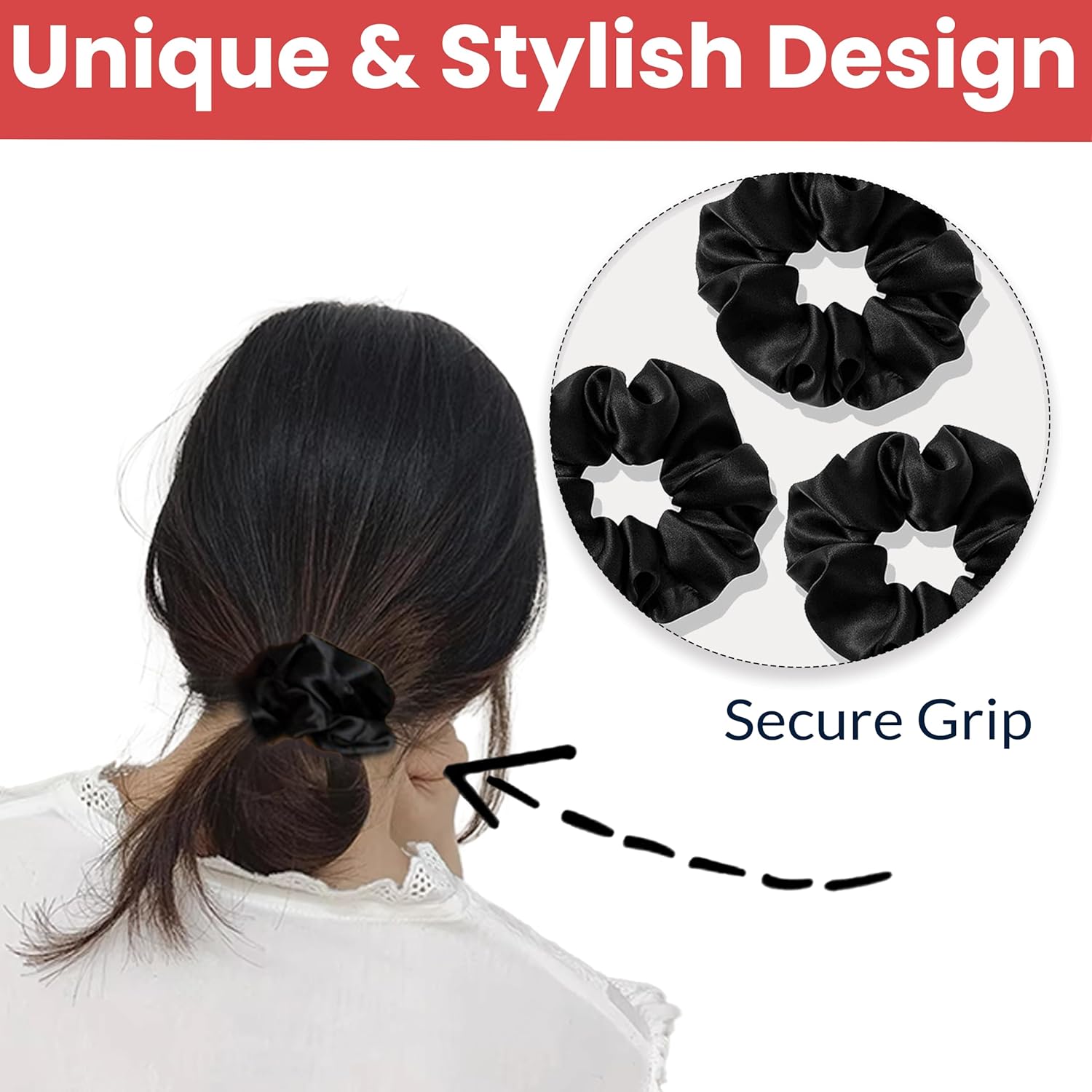 👩🏻 PACKAGE INCLUDES: 6 pcs of Premium Black Colour Hair Scrunchies. It is has high quality Elastic Rubber Band which can be scretched/folded to fit your size