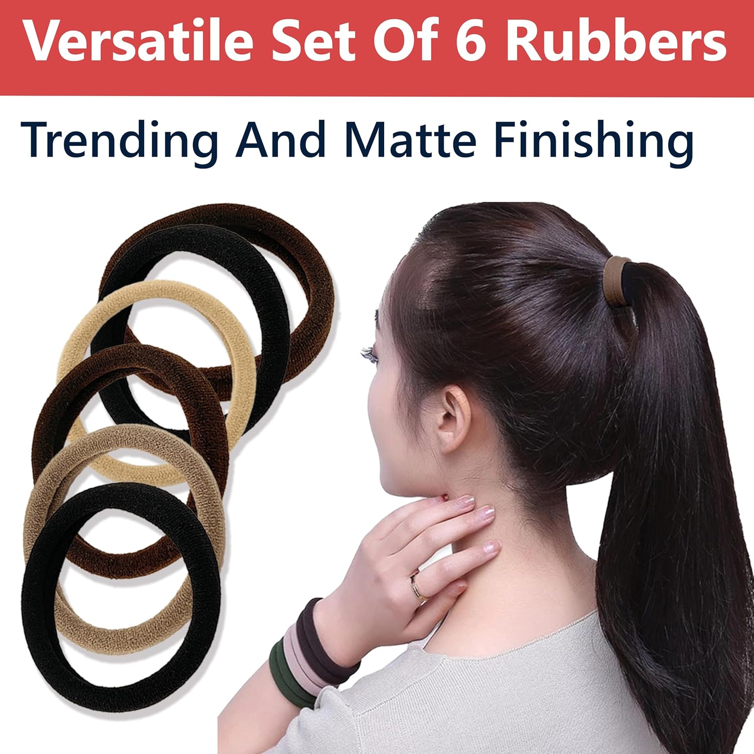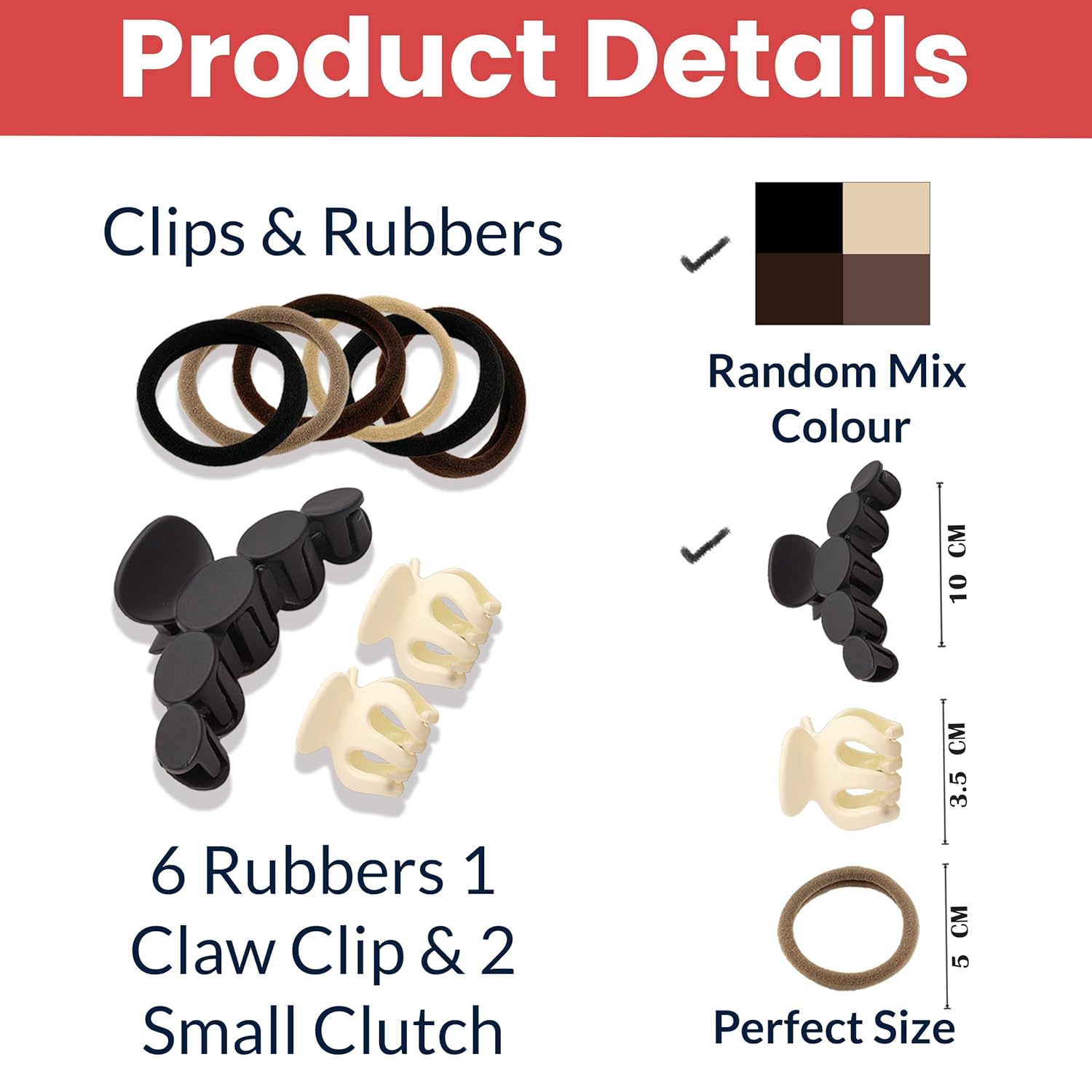 TEMPERIA (9pcs) Hair Claw Clips & Rubbers Set for Women & Girls – Clutcher Clutches Large Claw Clips Accessories – Stylish, Fashional (Random Colors) (6 Rubbers, 1 Claw Clip & 2 Small Clutch) – (MN02)