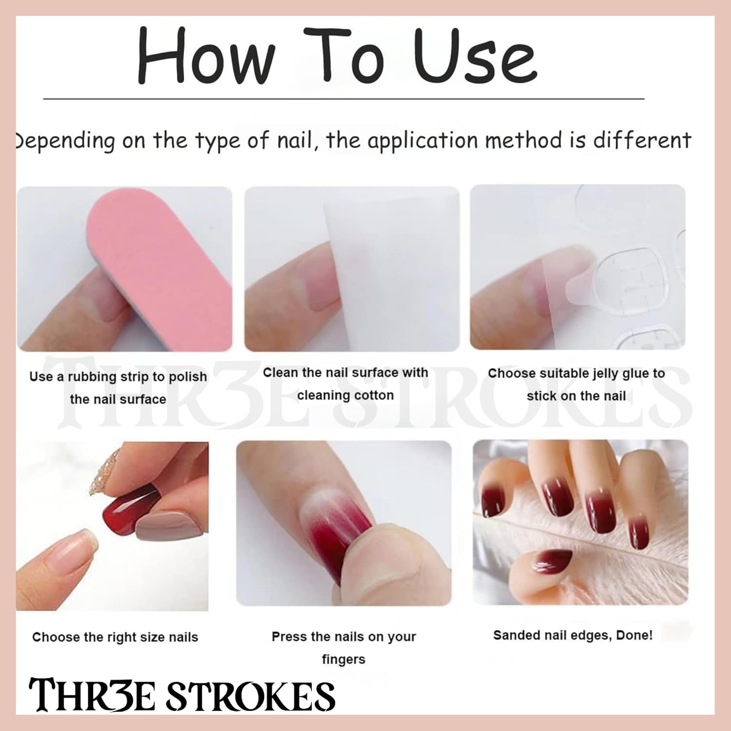 Easy Application: The set comes with 1 sheet of glue tabs, an alcohol wipe for prepping nails, a manicure stick, and a mini file for seamless application.