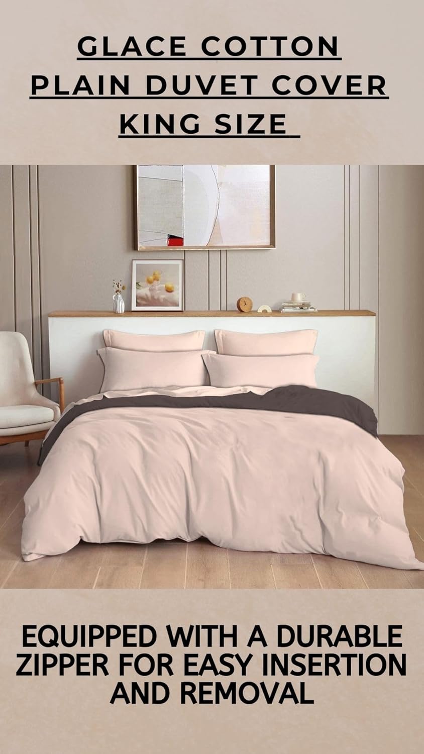 Transform your bedroom into a cozy and stylish sanctuary with our Plain Duvet Cover. Designed for king size beds and double beds, this versatile cover measures 90×100 inches, making it an ideal choice for various bedding needs. Key Features: Material: Crafted from high-quality Glace Cotton, this duvet cover offers a soft, luxurious touch that ensures a comfortable and restful night’s sleep. Multi-Purpose: Whether you need a duvet cover, blanket cover, or quilt cover, this all-in-one solution caters to your needs, making it a practical addition to your bedding collection. Convenient Closure: The durable zipper closure allows for easy insertion and removal of your duvet or quilt, ensuring a snug fit and a tidy appearance. Lightweight Yet Sturdy: With a fabric weight of 140 GSM (grams per square meter), this cover strikes the perfect balance between lightweight comfort and robust durability. Elegant Design: The plain, understated design seamlessly blends with any bedroom décor, adding a touch of elegance and sophistication. Easy Maintenance: Designed for convenience, this duvet cover is machine washable, making it simple to keep clean and fresh. Breathable Fabric: The breathable Glace Cotton fabric promotes airflow, ensuring a cool and comfortable sleeping environment. Upgrade your bedding with our Plain Duvet Cover, combining functionality, comfort, and style in one exceptional product. Enjoy a restful night’s sleep wrapped in the softness and durability of Glace Cotton.