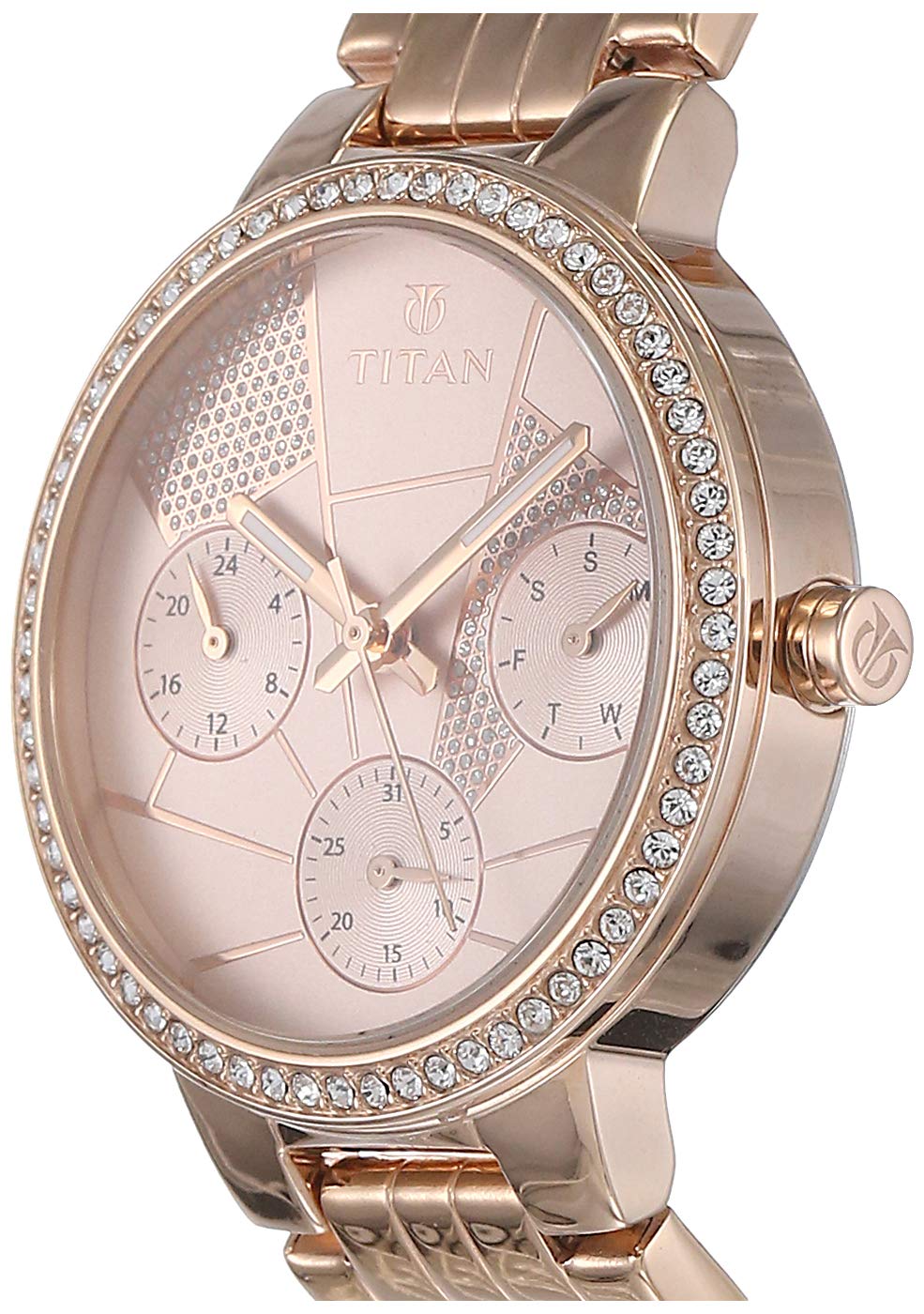 Rose-gold designed bracelet ; Embellished bezel ring with Swarovski crystals ; Mosaic patterned dial with shiny UP glitter