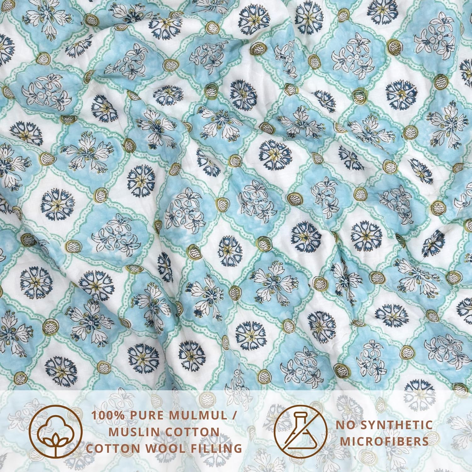 MATERIAL: TOAI quilt/ rajai is made from Pure Mulmul / Muslin Cotton. It is a fine , lightweight and strong fabric which is skin friendly and easy to maintain. Natural cotton-wool is used as filler for the quilts, we do not use synthetic microfibers. Our quilts are machine stitched from all 4 sides and are hand-quilted through-out the length and width of the fabric. Our quilts are suitable for all age-groups , from kids to adults, and especially recommended for people with sensitive skin.