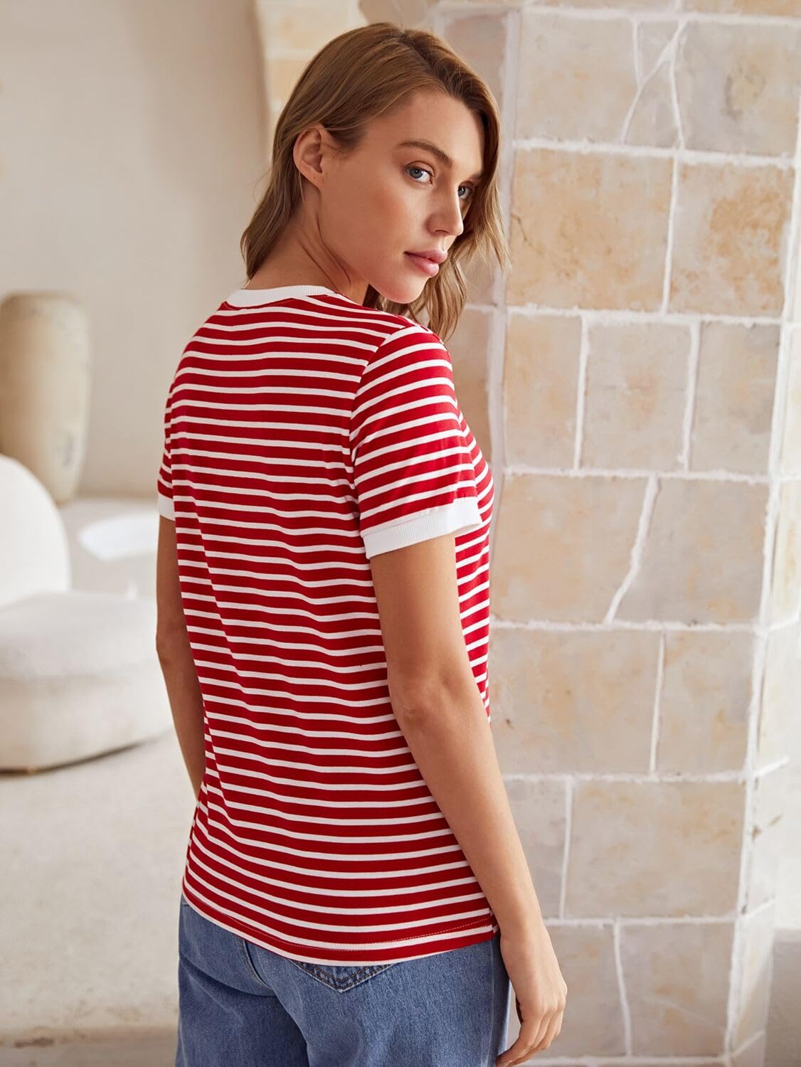 TOPLOT Stripe Printed Short Sleeve Regular Fit Top for Women