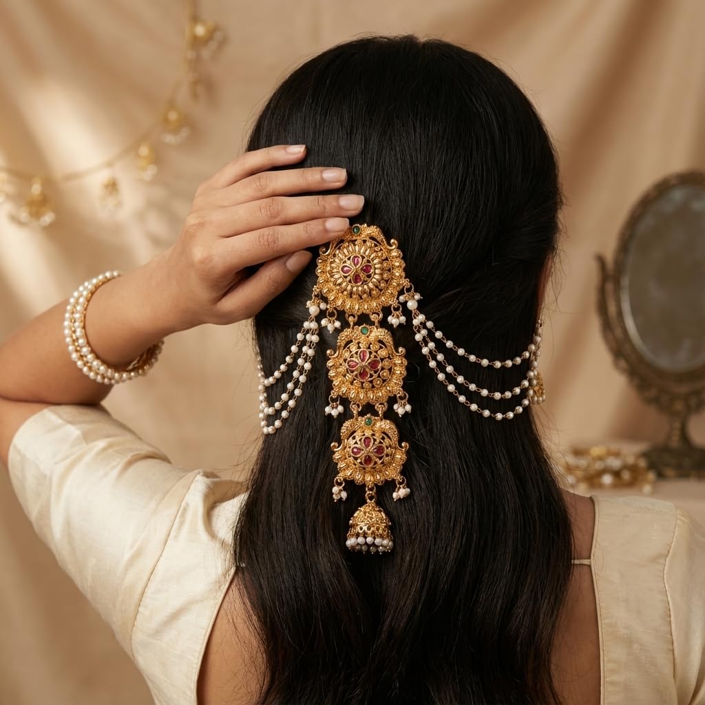 Traditional Temple Style Bridal Hair Accessory crafted with intricate antique detailing. Gold-plated finish with rich, heritage-inspired design for a royal look. Embellished with ruby red & green stones for a vibrant, festive appeal. Adorned with premium pearl chains and elegant jhumka drop danglers. Features a multi-layer center brooch pin with classic temple motifs. Comes with secure hooks and pin attachments for easy and firm styling. Perfect for bridal Juda, bun, or braid decoration. Ideal for South Indian & Maharashtrian weddings, traditional functions, and festive wear. Complements silk sarees, bridal lehengas, and ethnic ensembles beautifully. A timeless antique-inspired ornament that enhances bridal hairstyles with grace