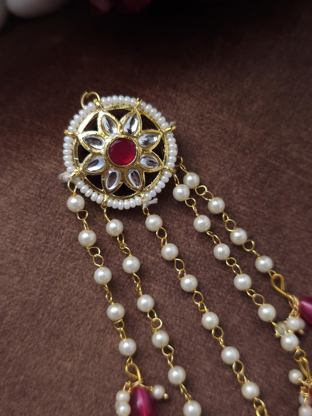 ELEGANT DESIGN: Traditional kundan-style hair clip featuring a floral pattern with crystal stones, red center stone, and pearl border, complemented by hanging pearl chains