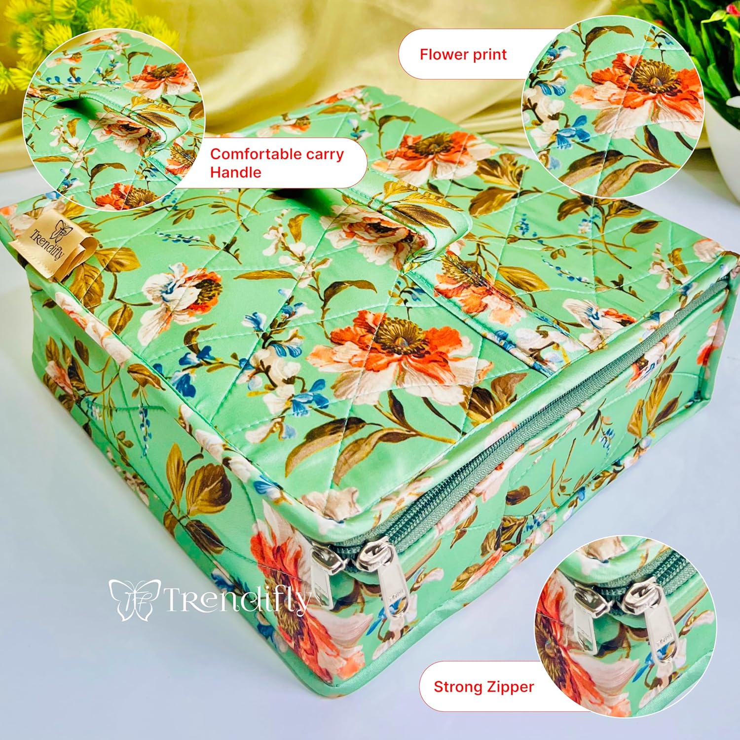 Trendifly Flower Printed Jewellery Organizers Storage Pouch Bag Box For Women Girls Ladies | Necklace Earrings Rings Bangles Multipurpose Vanity Jewelry Organiser (Green)
