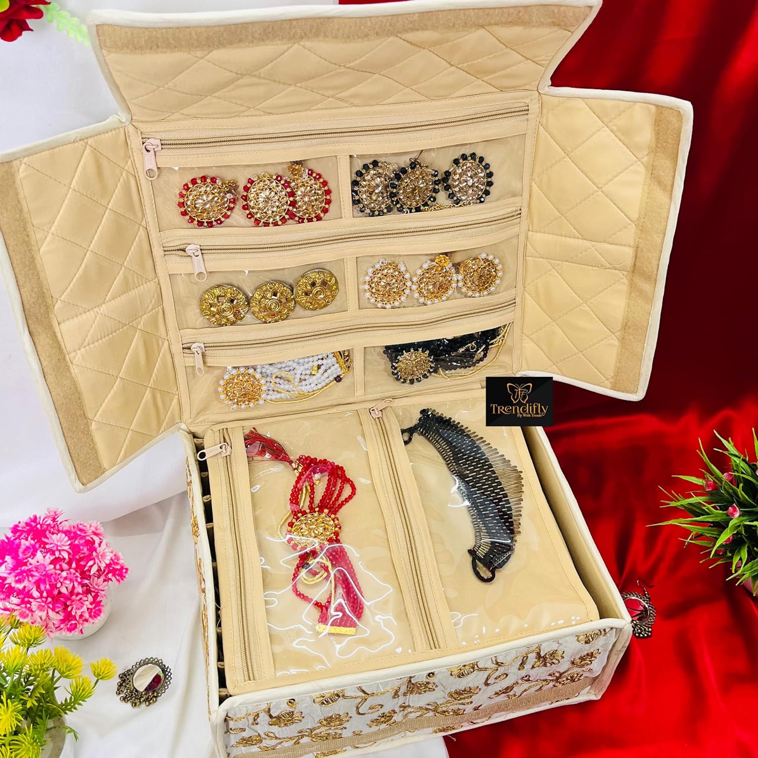 Introducing the Trendifly Royal Jewellery Organizer bag for women. the ultimate storage solution for your precious jewelry. Made with high-quality Embroidery work silk and cotton, this cosmetic makeup organiser offers a stylish and protective home for your earrings, rings, bracelets and Necklace.