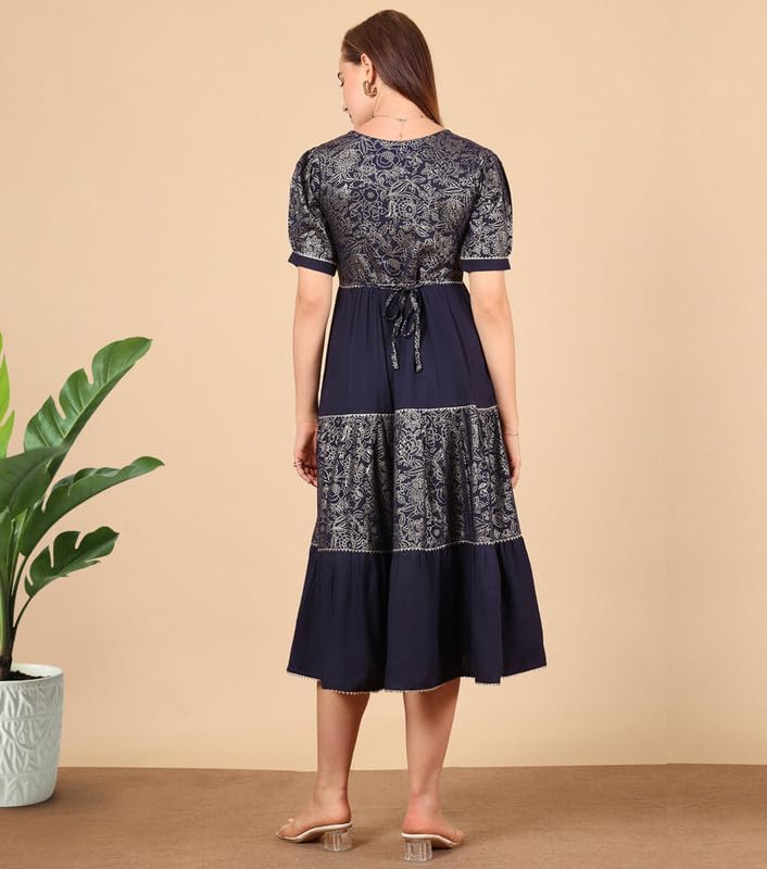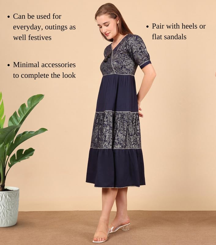 This one-piece fit & flare midi dress is crafted from viscose rayon, offering a breathable, soft, and moisture-wicking fabric that ensures comfort all day long. It features an artistic ready foil print pattern that adds a touch of elegance and modern style. The dress is designed with a V-neck, short puff sleeves, and an attached tie-up belt at the back for a customizable and flattering fit. Its versatile a-line fit & flare silhouette makes it perfect for daily wear, casual outings, office, festive celebrations, parties, weddings, ceremonies, and gifting, combining comfort with style effortlessly.
