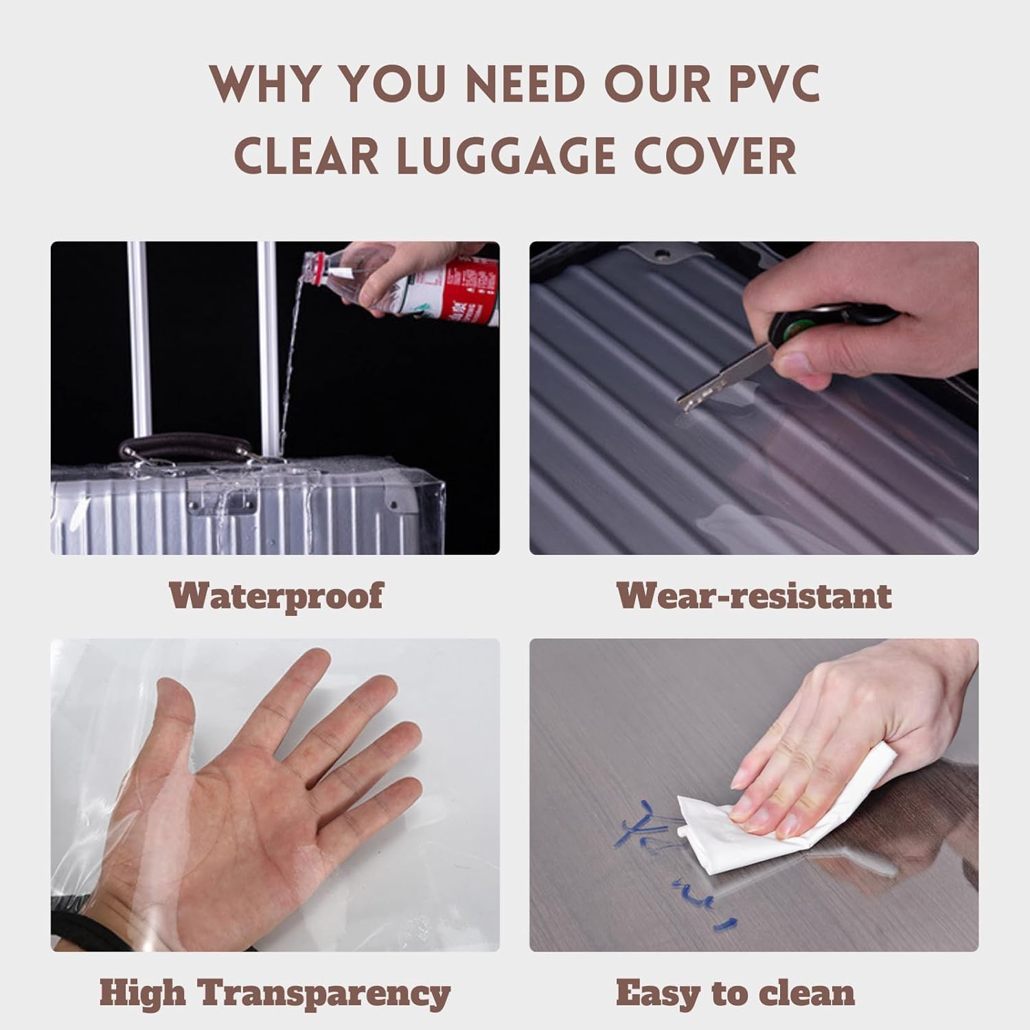 Perfect Fit Tailored for a snug fit on most medium to large hard-shell suitcases.Durable PVC Fabric: Thick, transparent PVC material offers strong protection while being flexible and easy to handle.Waterproof & Dustproof: Defend your luggage from rain, spills, and dust with confidence.Zippered Closure: Easy-to-use zipper ensures quick application and removal, with secure closure for full coverage.Crystal Clear Design: Transparent finish lets you showcase your suitcase style and makes it easy to identify at baggage claim.Reusable & Easy to Clean: Simply wipe clean with a damp cloth; reusable for every trip.