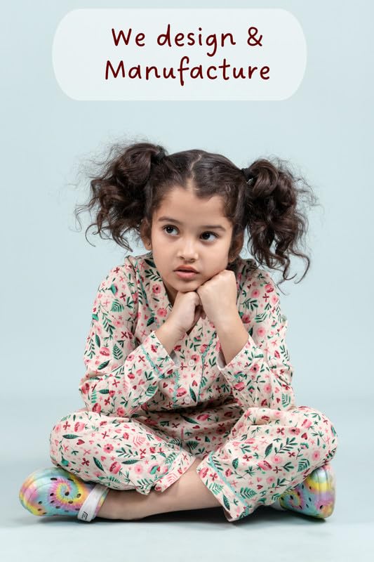 Add a dash of style and fun to comfort in our kids sleepwear range. Styled with a collar and contrast button piping detail, shirt and pajama is sure to make your little girl jump with joy. Soft feel and breathability of Cotton ensures lasting comfort. Floral Print Nightwear Set consists of top and pyjamas has a collar neck, long sleeves has front button closure with attached on patch pocket. Bottom pajama has elasticated drawstring.
