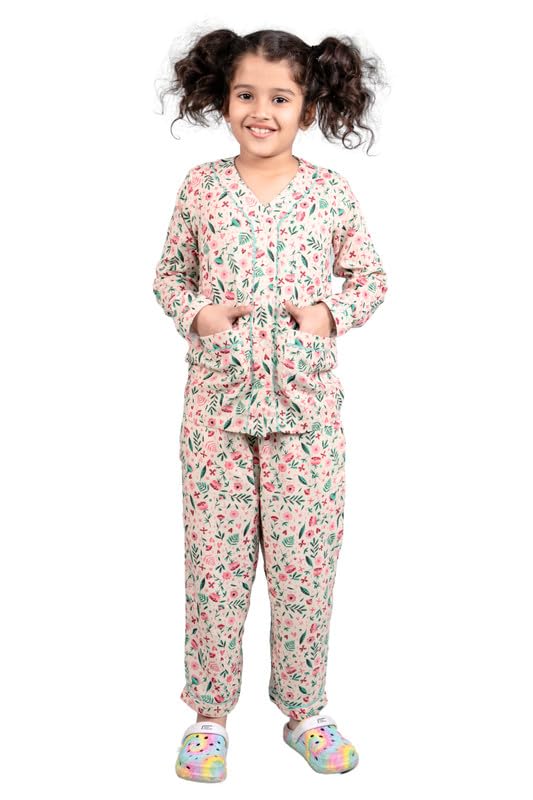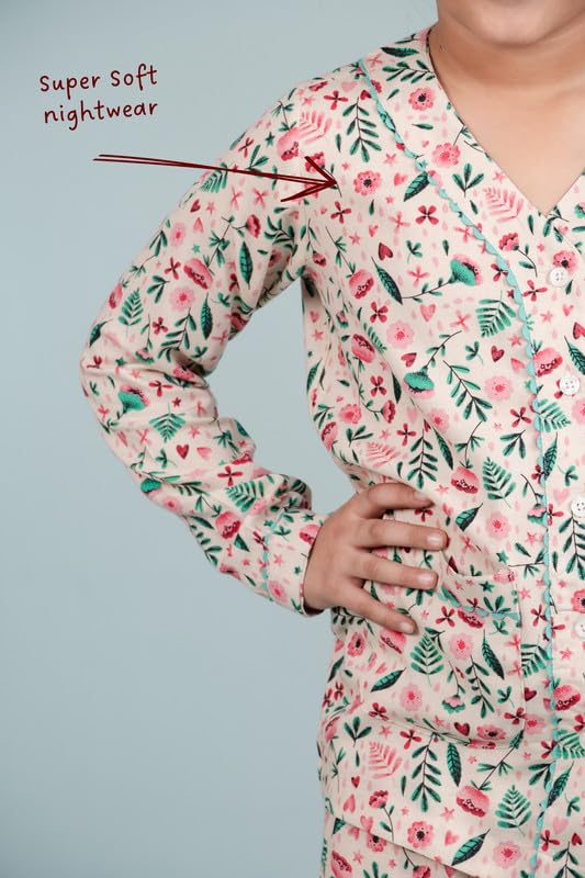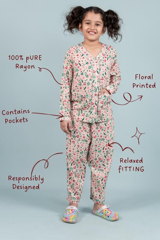 Tweeny Mini Kids Girls Pure Rayon Night Suit | Sleepwear| Night Wear | Nightdress | Top Shirt & Pyjama Combo Set Floral Printed with Pockets Full Sleeves
