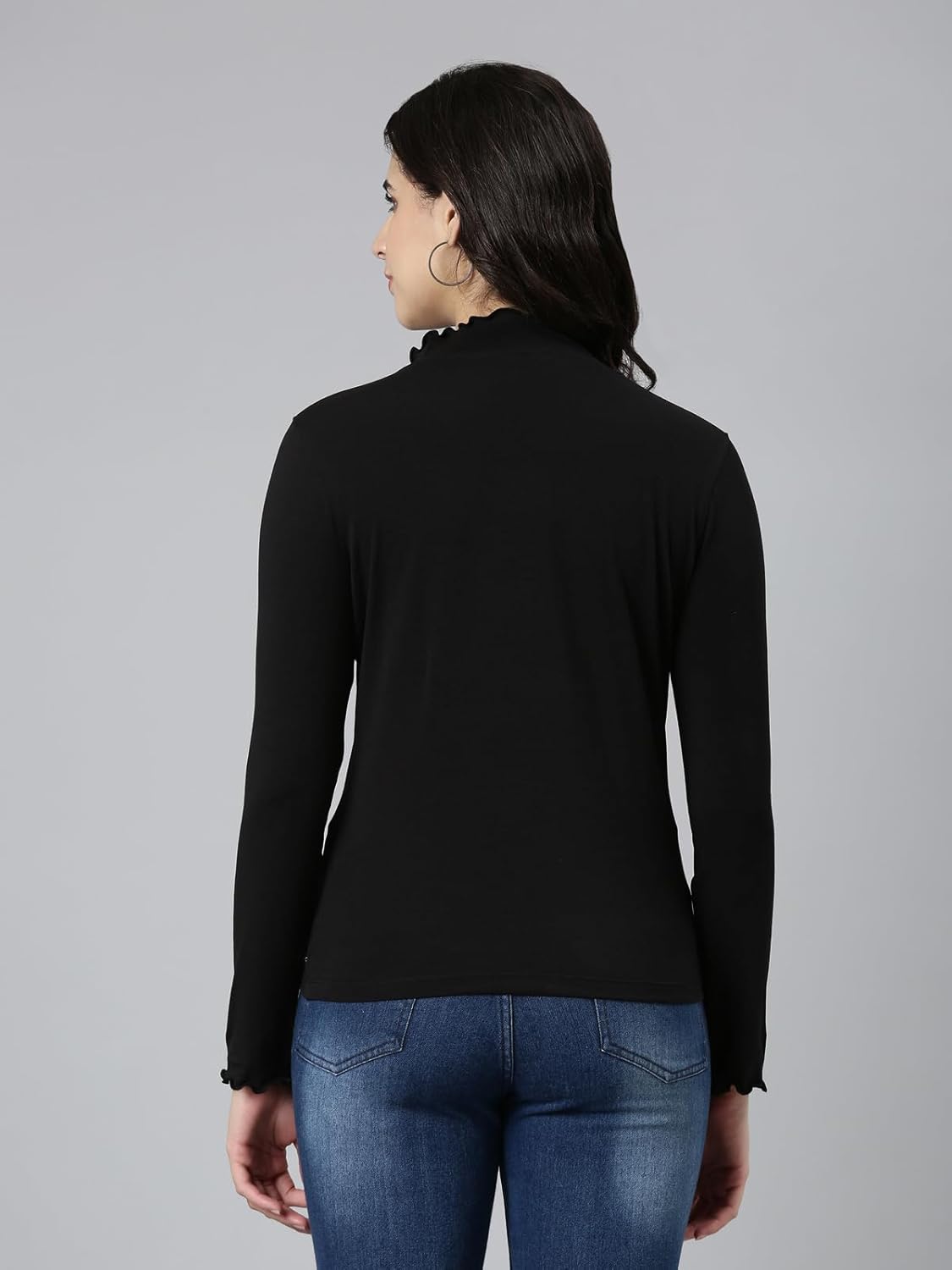 High Neck Knitted Top With Frills At Neck And Full Sleeves. Made Of Soft Material, Comfortable, Stretchy Cotton Fabric. ‘Twin Birds’ Branded Metal Badge Attached. Casual Fashion Daily Wear. Combine This Style With Our Twin Birds Range Of Products For A Cool, Layered, New Look & Feel.
