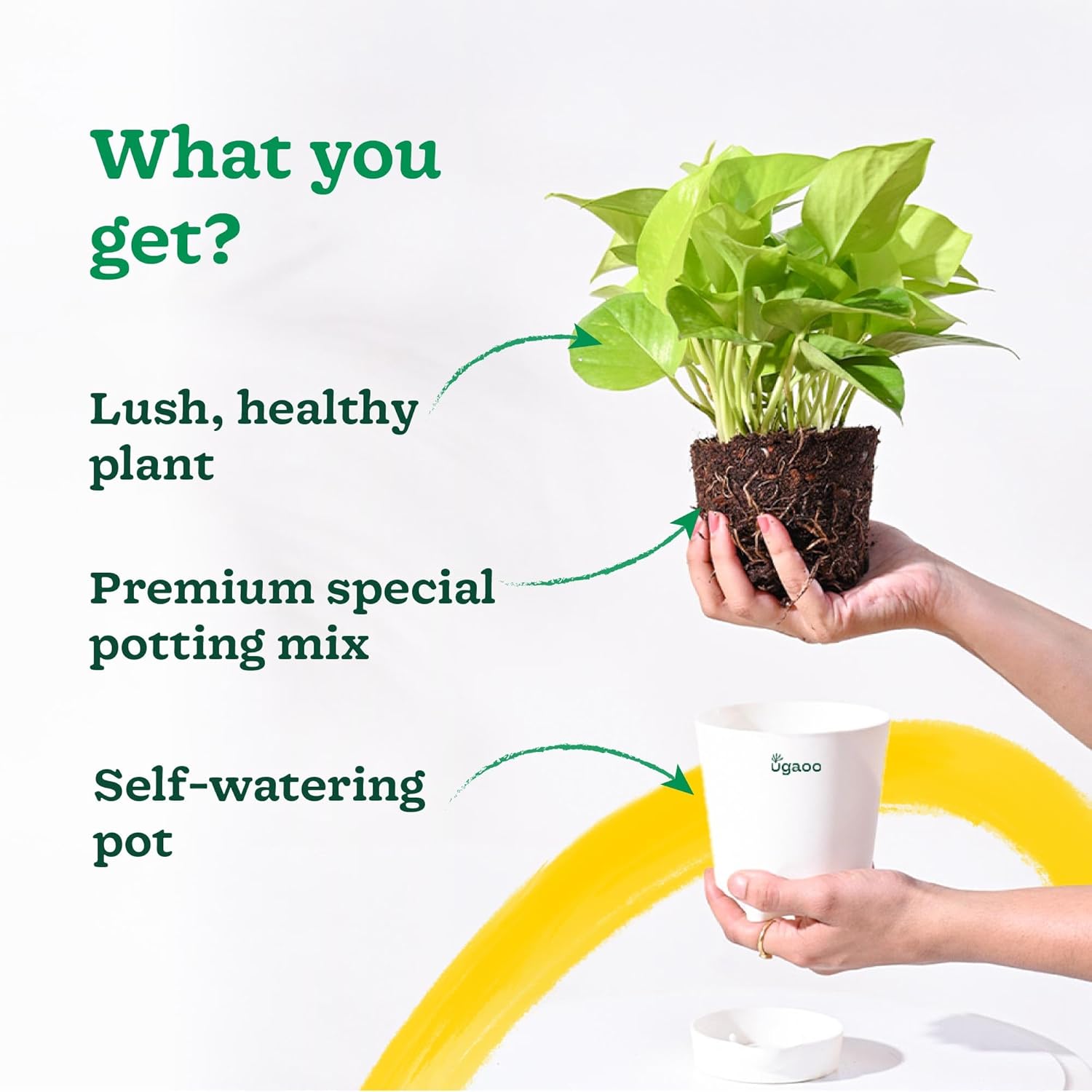 Live Plant with Pot. Pot is self- watering where excess water gets stored in the reservoir below, the roots then absorbs water via capillary action and the plants get water as and when required, allowing you to water less frequently. Making it perfect plant for office desk.